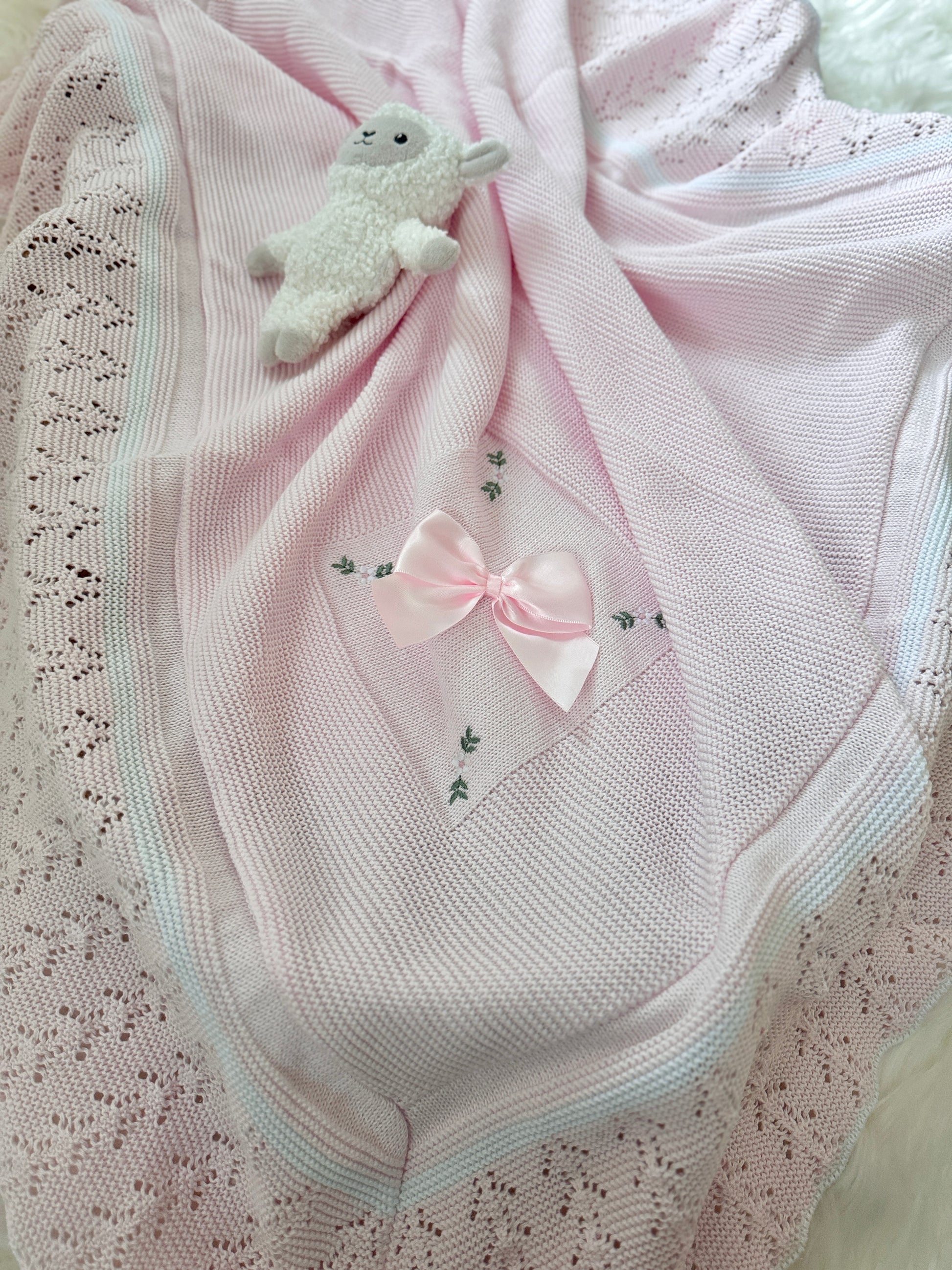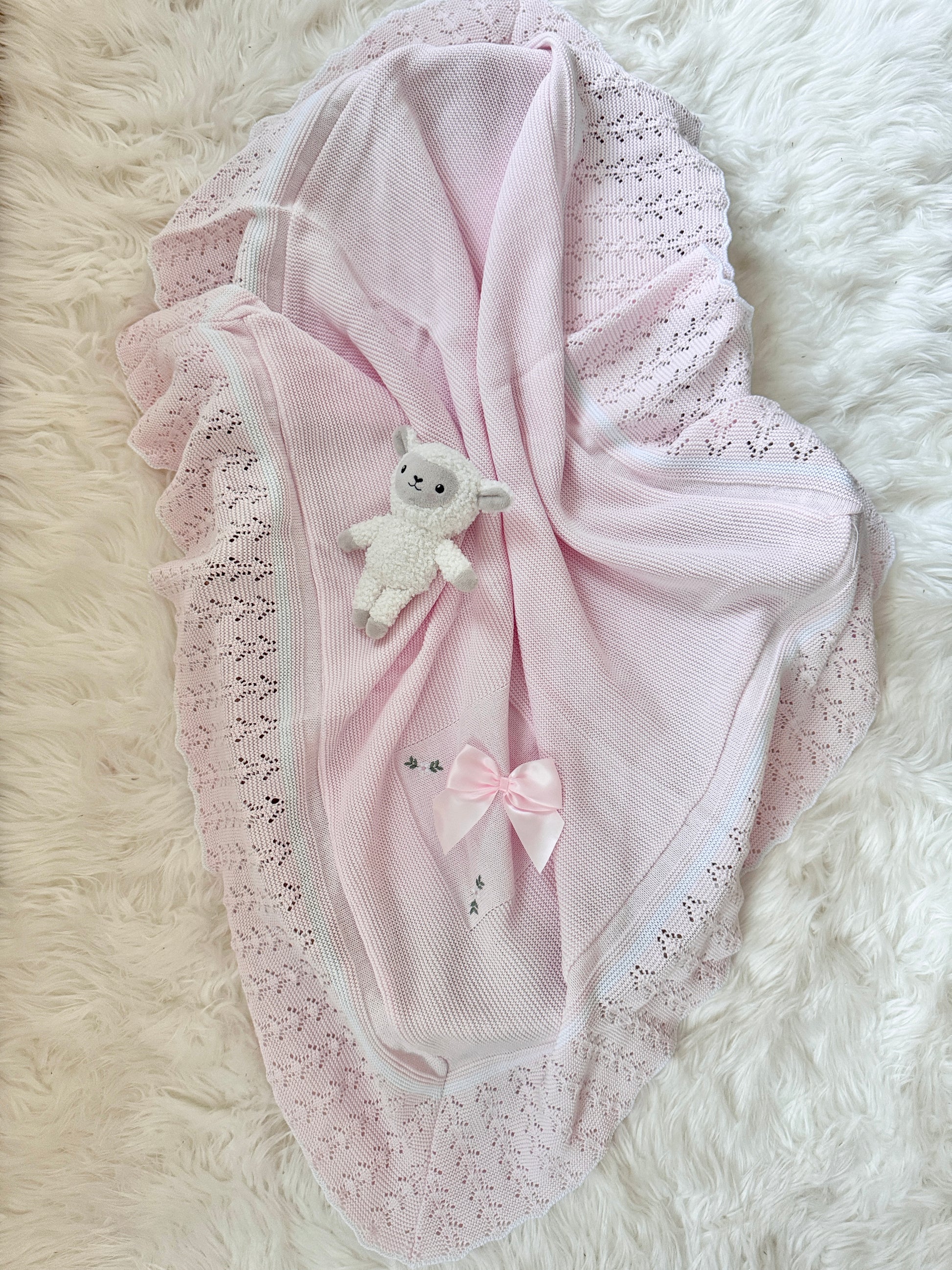 Esta manta está hecha de material de punto suave y presenta intrincados detalles de crochet y un lazo encantador.