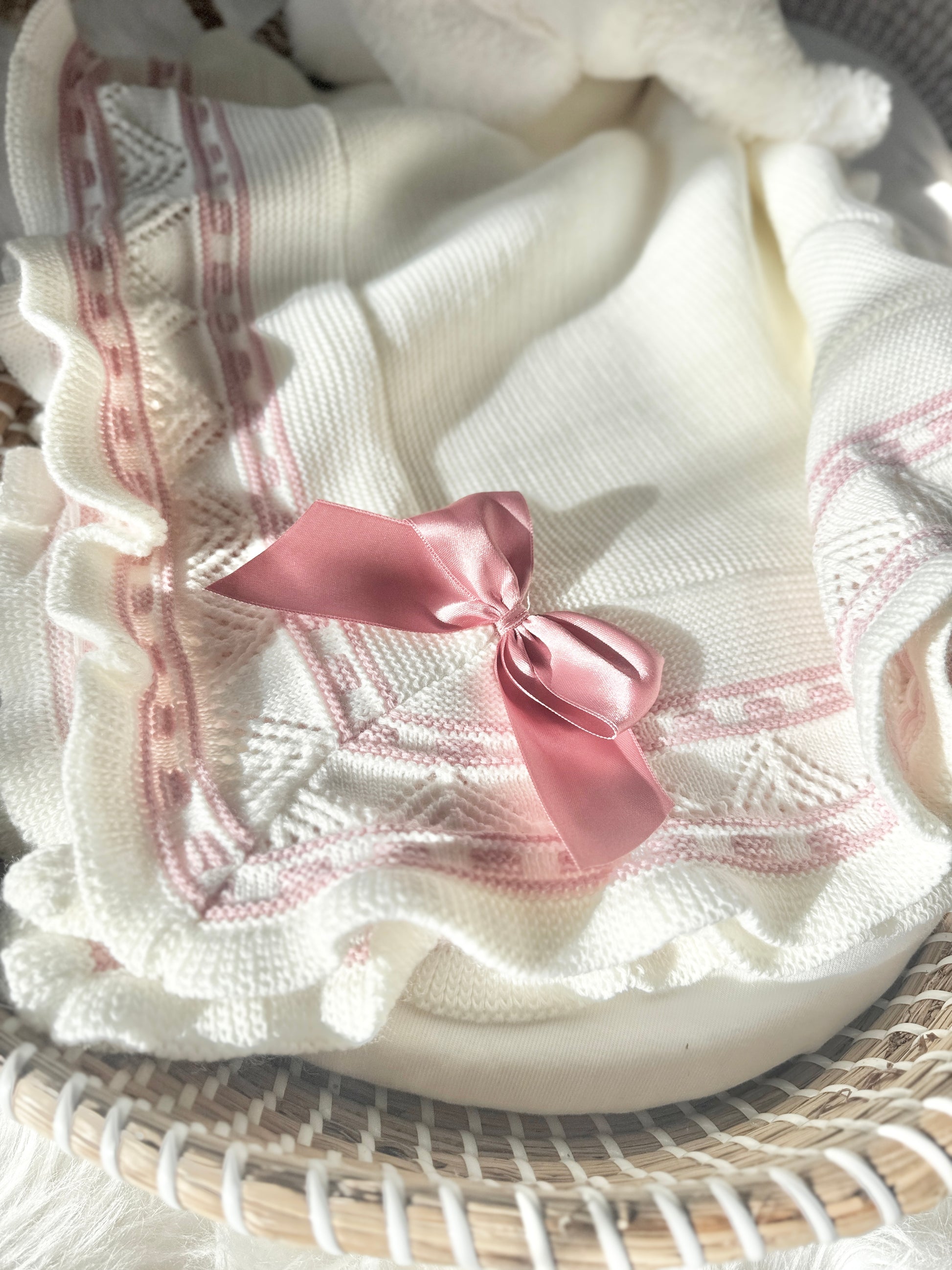 Esta manta está hecha de material de punto suave y presenta intrincados detalles de crochet y un lazo encantador.