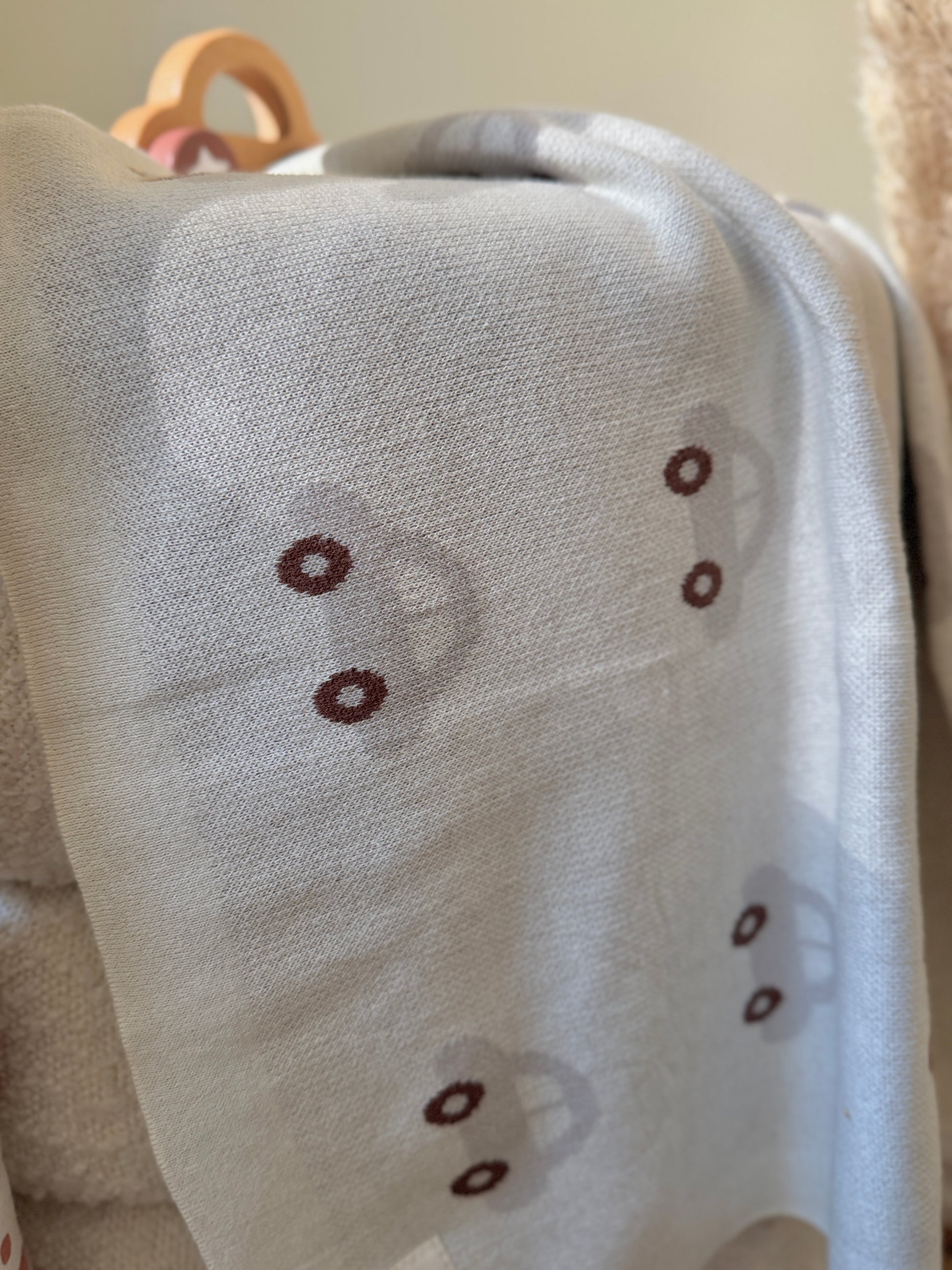 Presentamos nuestra manta para coche en beige, hecha 100 % algodón y con adorables coches en marrón. Es perfecta para recién nacidos y se puede personalizar. Mantén abrigado y con estilo con este accesorio imprescindible para tu pequeño.