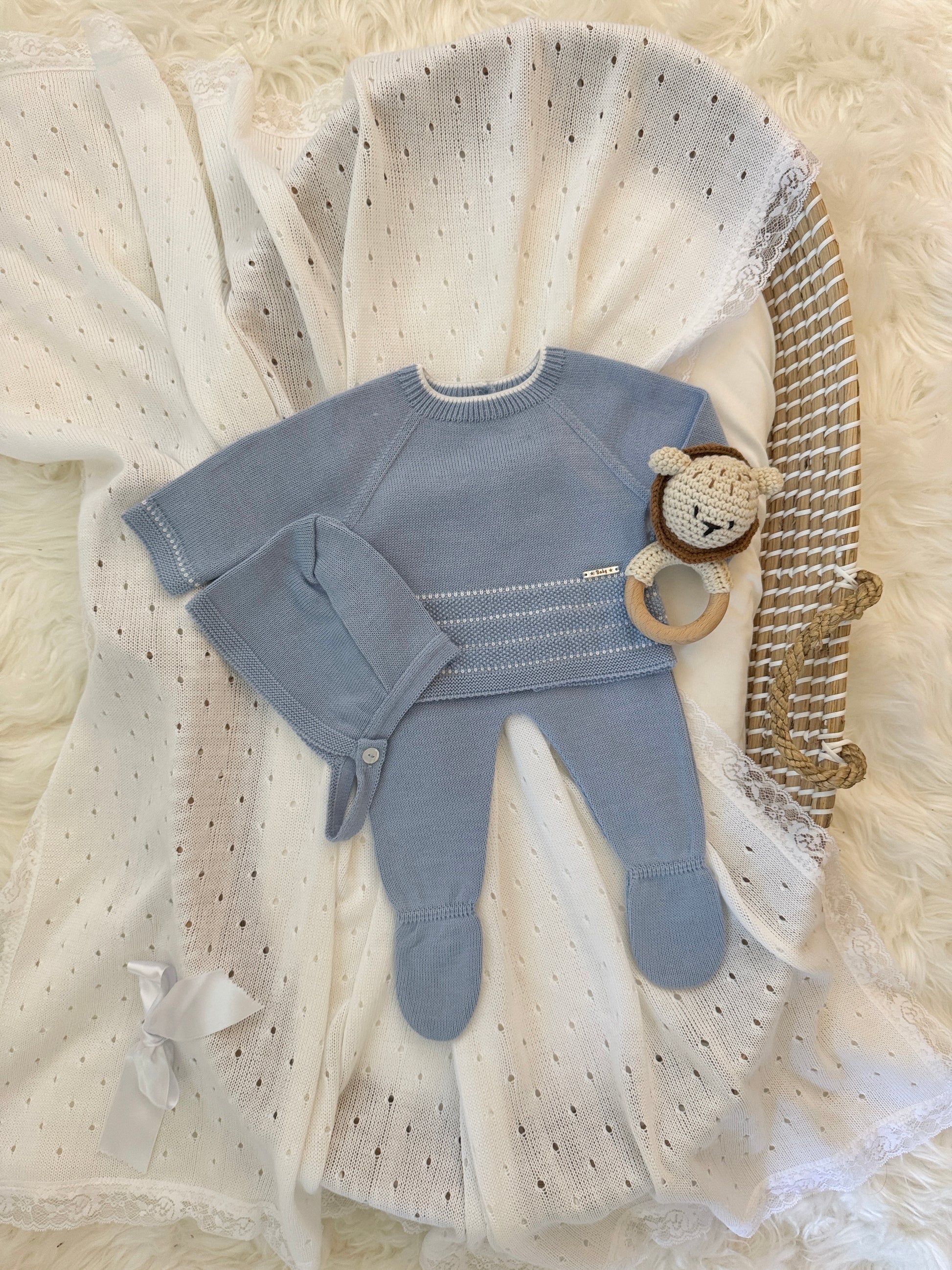 Mejora tu estilo con nuestro conjunto de punto de dos piezas Claran en azul. Este conjunto incluye un gorro a juego y rayas blancas, creando un look cohesivo y chic. Siéntete cómoda y con estilo con este conjunto imprescindible, perfecto para cualquier ocasión.