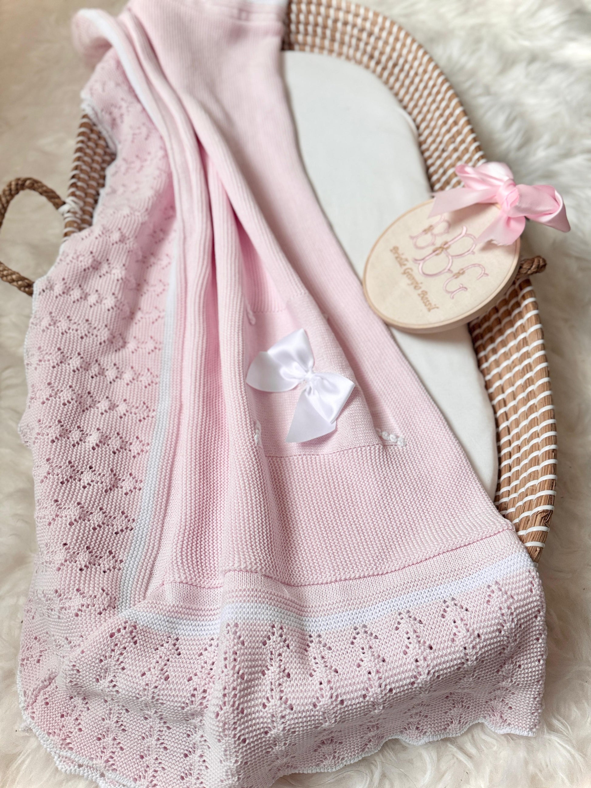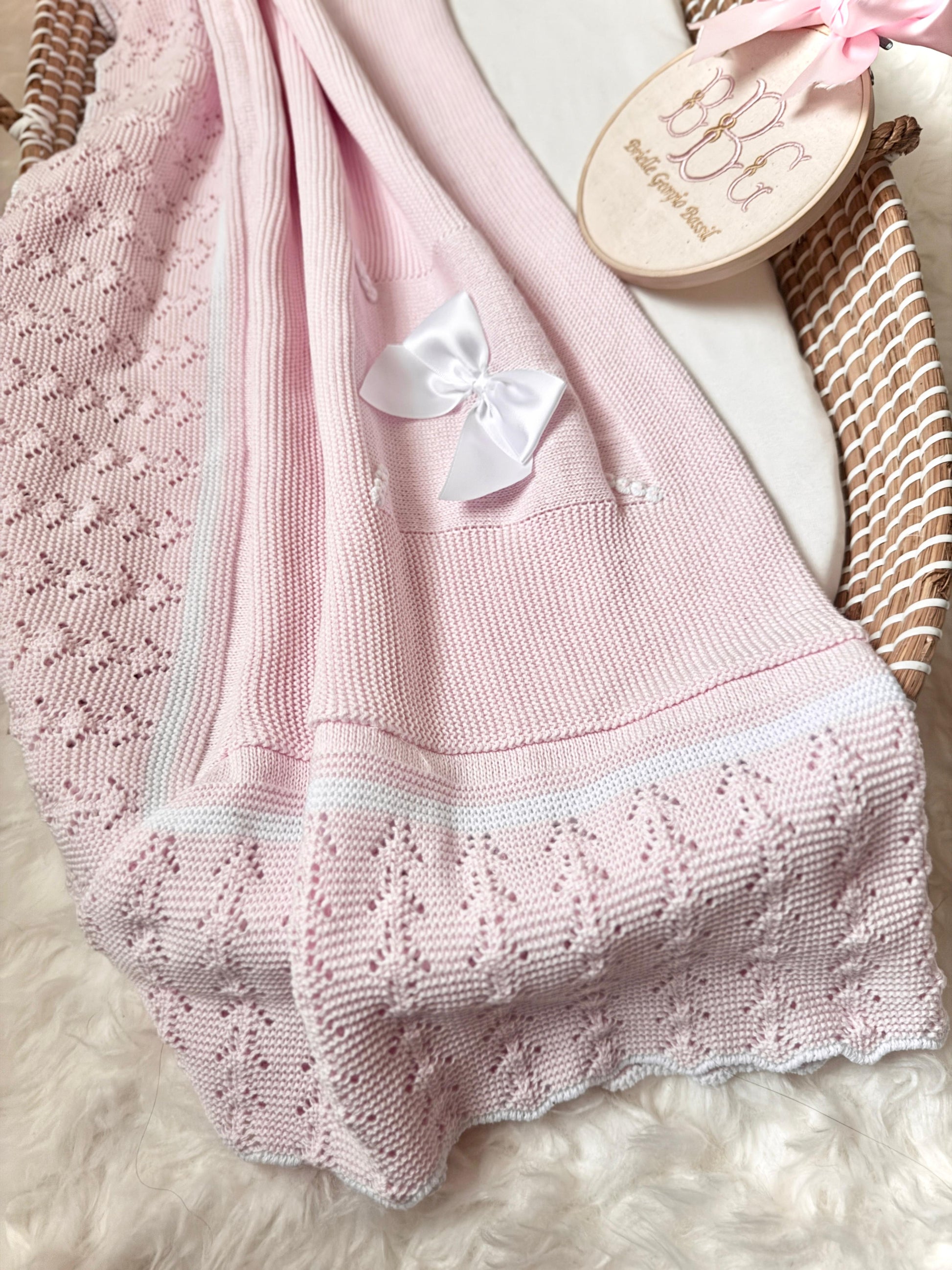 Esta manta está hecha de material de punto suave y presenta intrincados detalles de crochet y un lazo encantador.