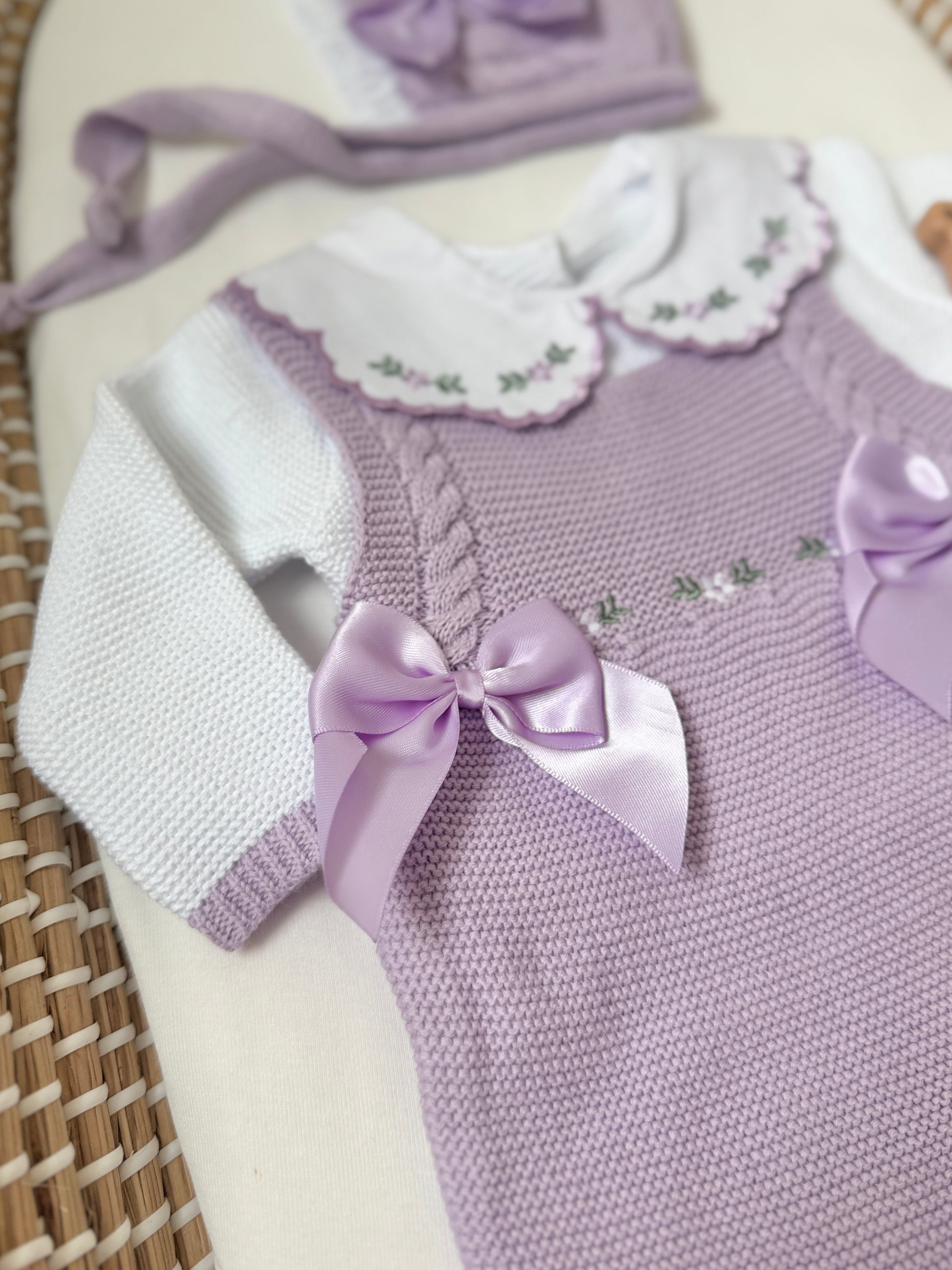 Welcome your little one home in style with our Alana Overall 3 piece knit set! This adorable set features a lilac overall with delicate floral details and satin bows, as well as a long sleeve knit top and matching hat. Perfect for a newborn baby girl, this spring-inspired set will keep your baby cozy and looking cute. Don't miss out on this must-have for your little one's wardrobe!