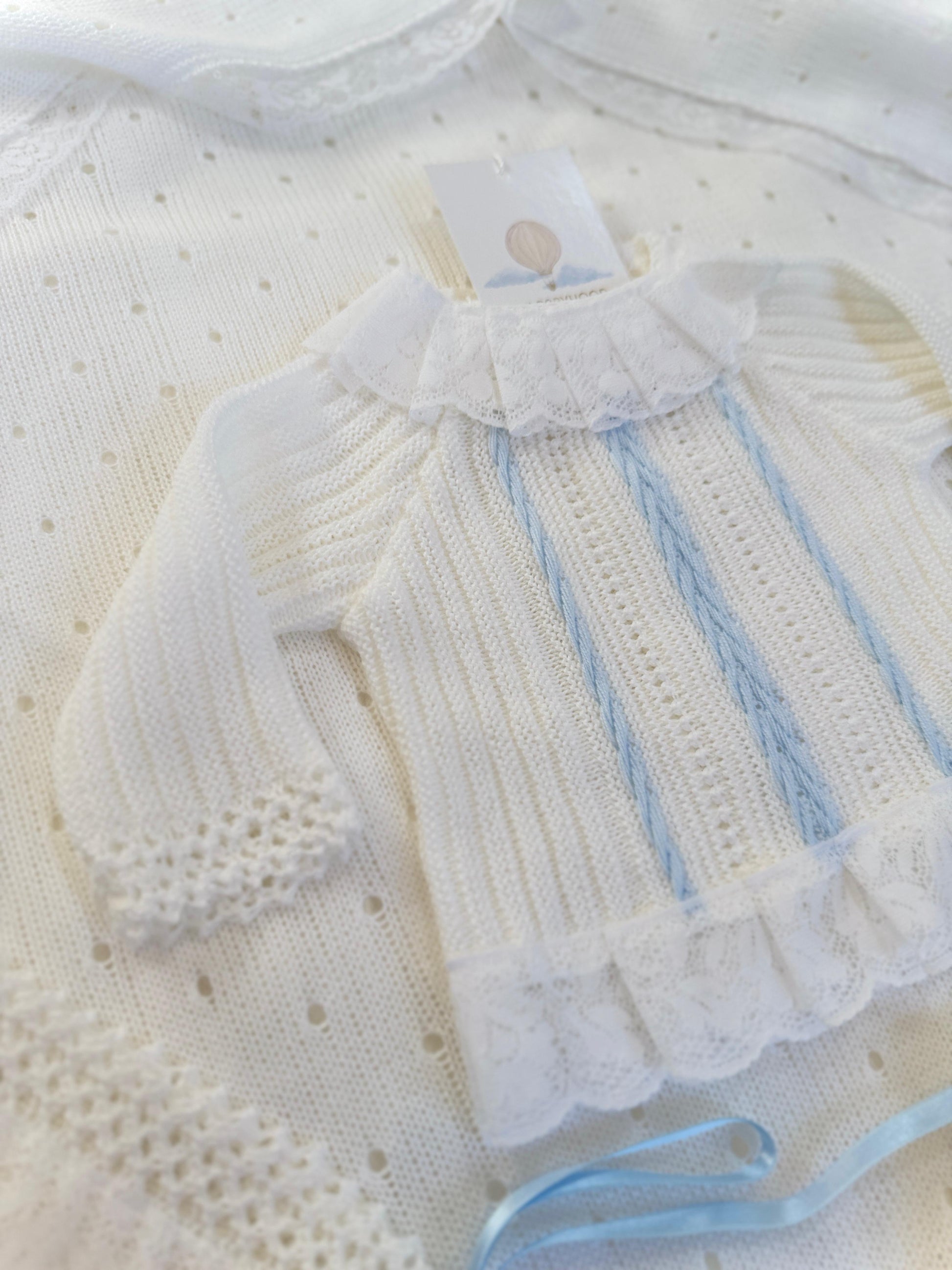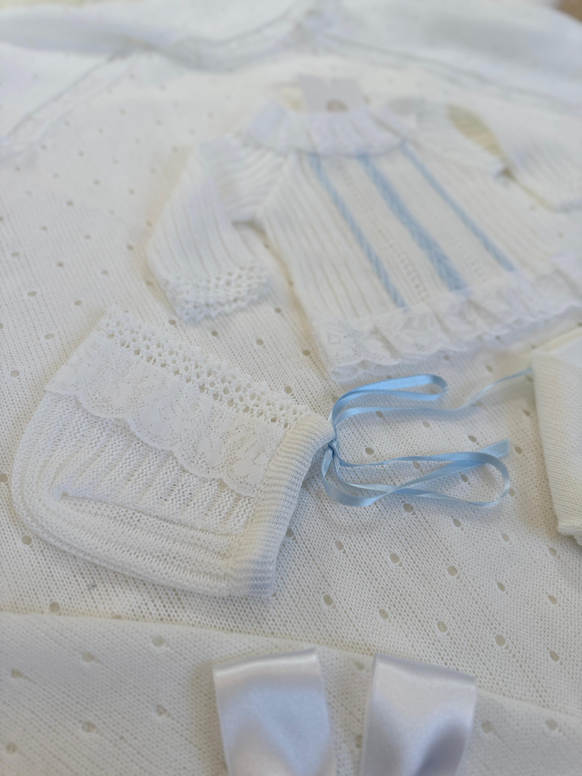 This 3-piece knitted set is perfect for your little boy, with its blue detailing and white base. Keep him warm and stylish all day!
