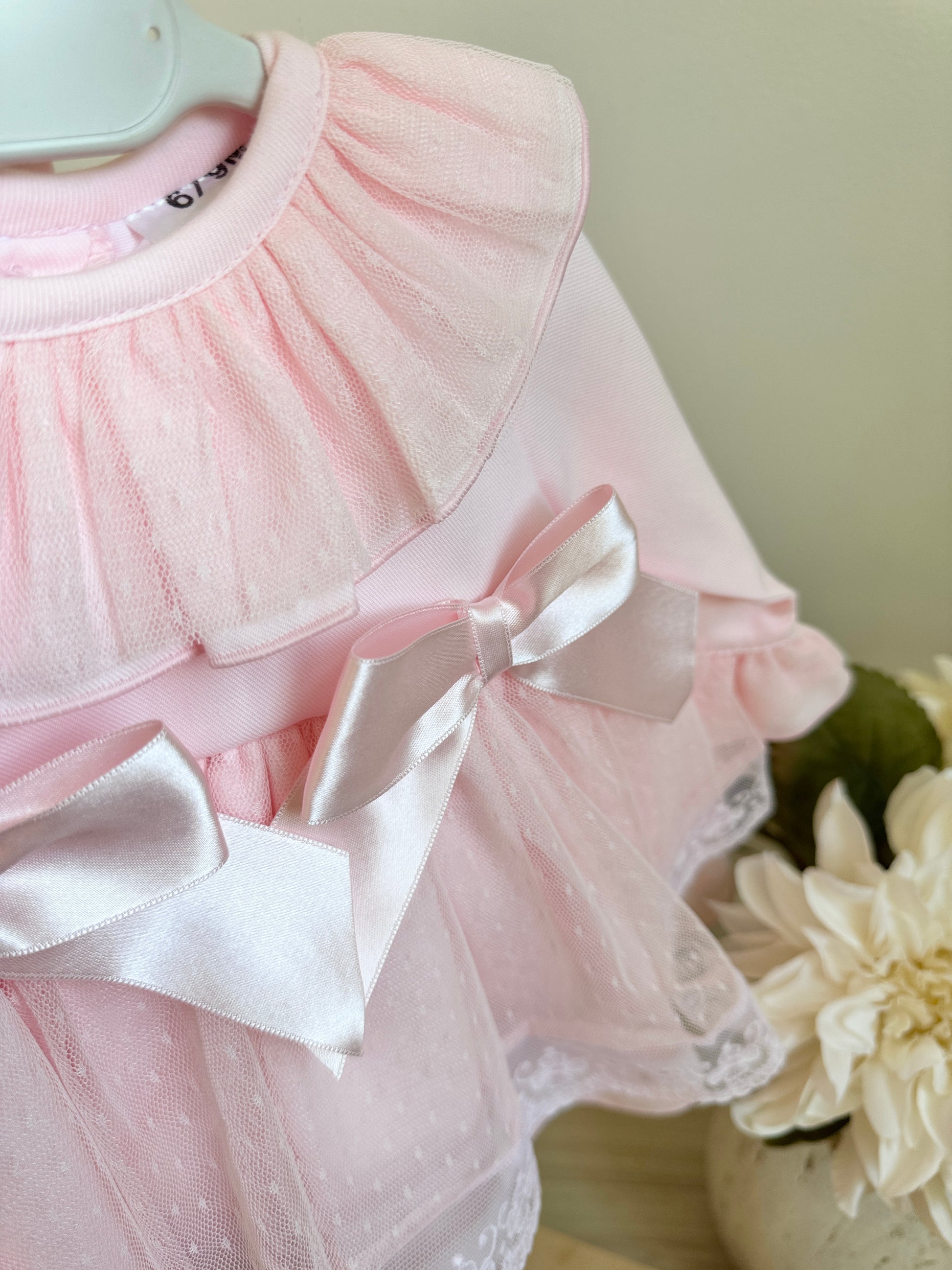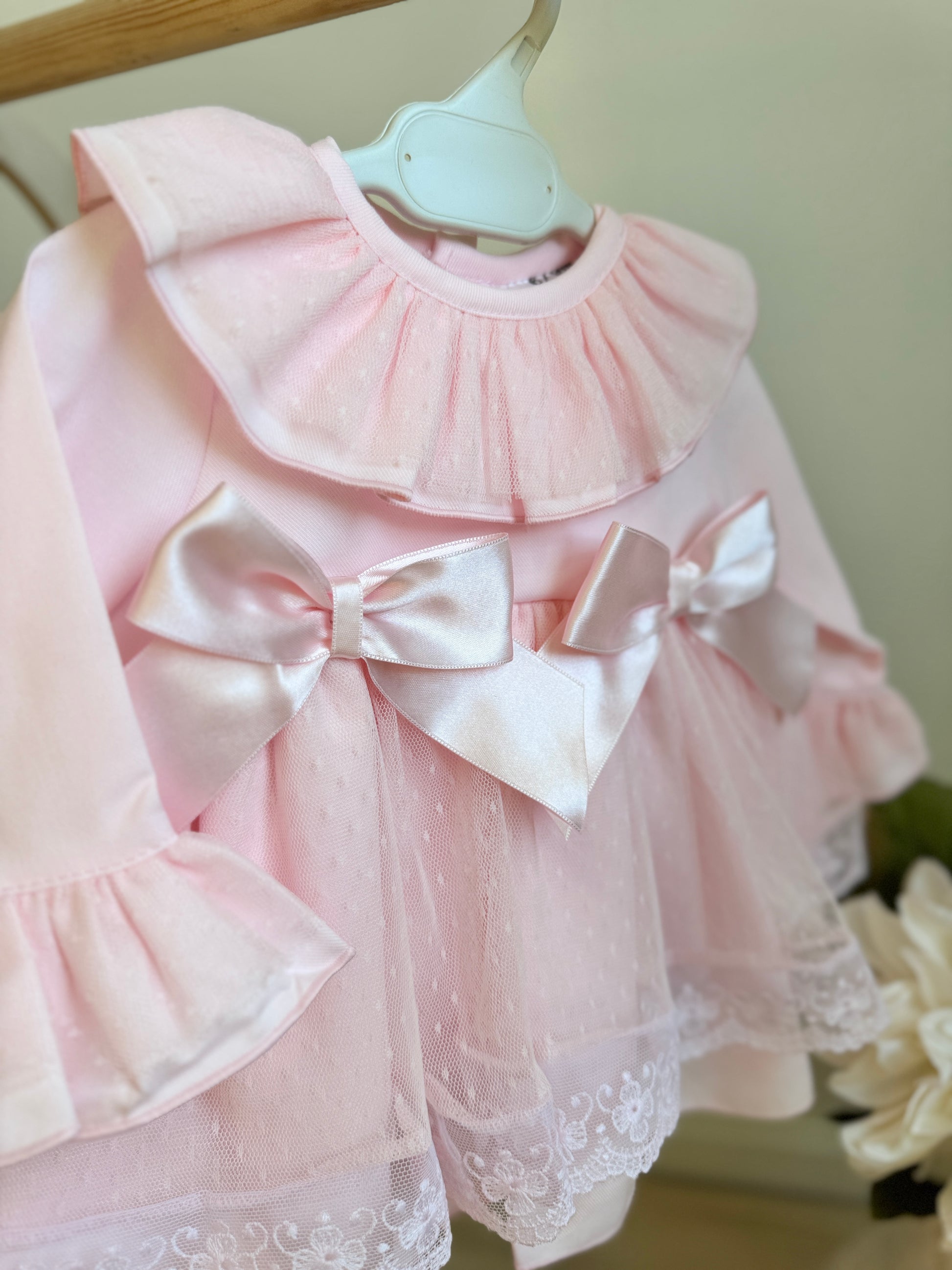 This delicate baby girl dress features intricate neck detailing and a tulle bottom skirt for a truly magical look. Perfect for special occasions, this dress will make your little one feel like a princess!