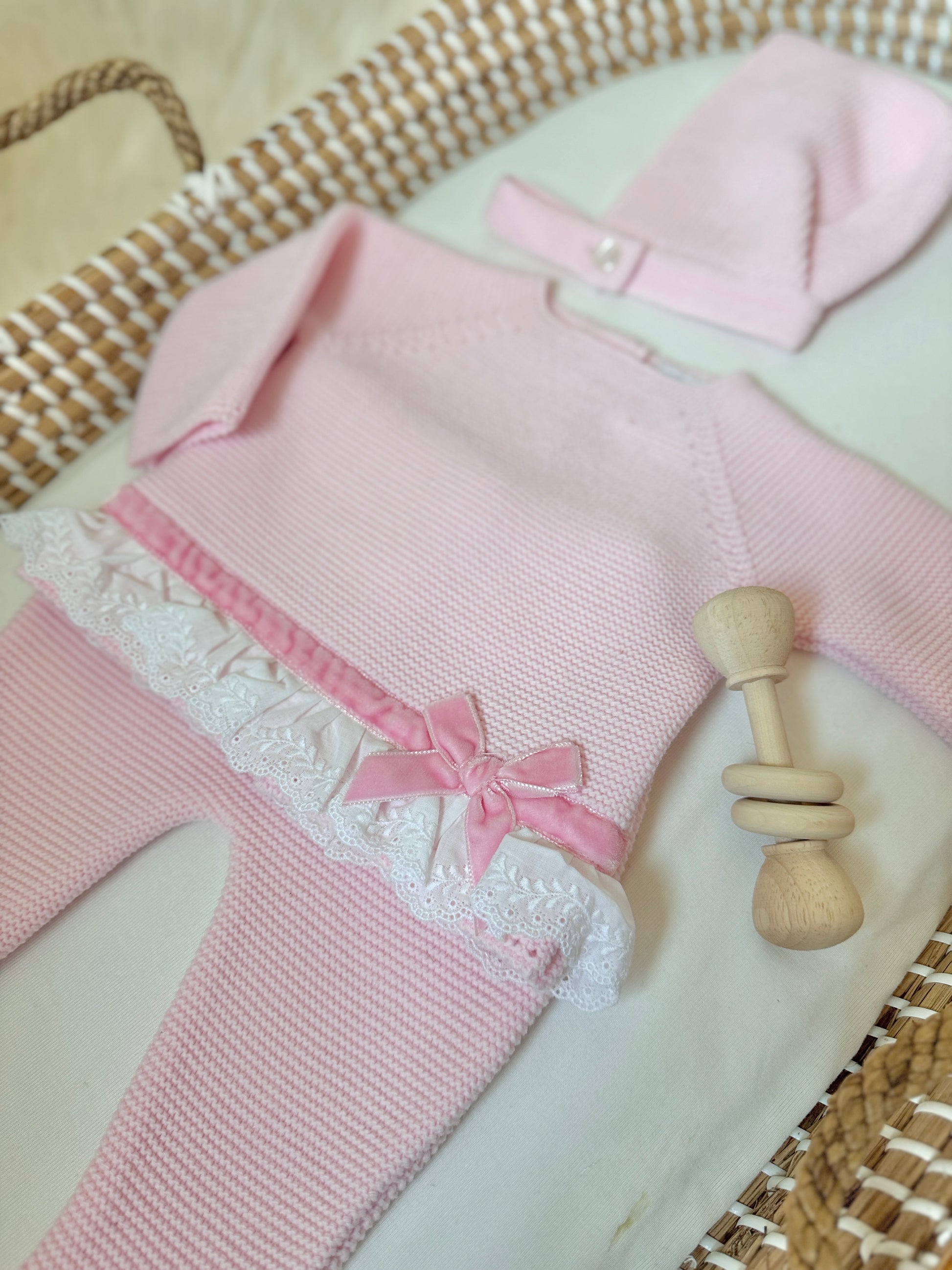 This adorable 3 pieces set includes a top, pants, and an adorable hat with cute detailing on the top with ruffles and a velvet bow!