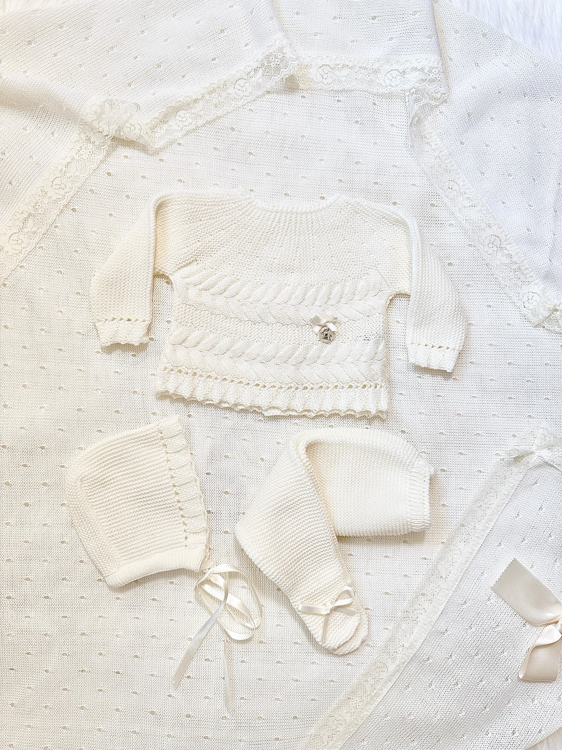This adorable 3 pieces set includes a top, pants, and an adorable hat with cute detailing on the top and ribbons on the pant.