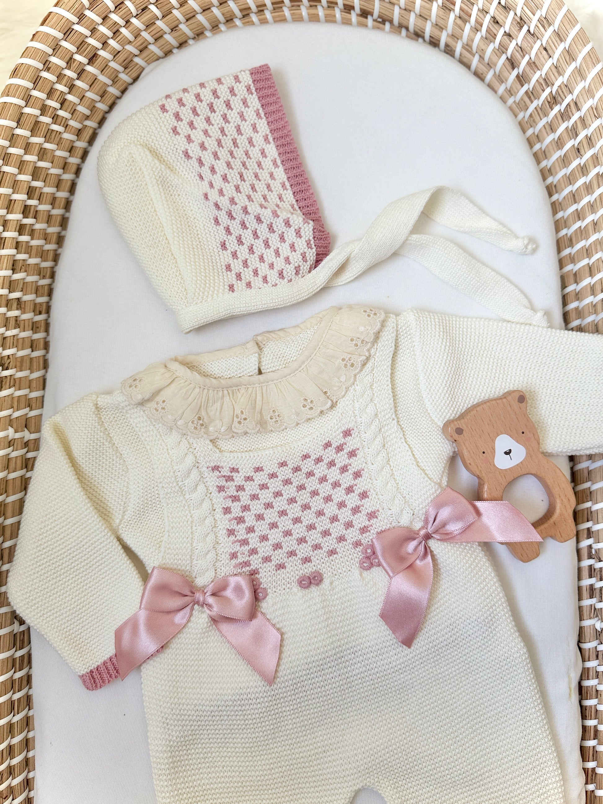Welcome your little one home in style with our Avery Overall in Cream/ Dusty Pink! This adorable set includes a cream overall dusty pink details and two satin bows, paired with a cream knit long sleeve top and matching hat. The bows add a touch of sweetness to this coming home outfit for your newborn baby girl. Elevate their first outfit with our Avery Overall!