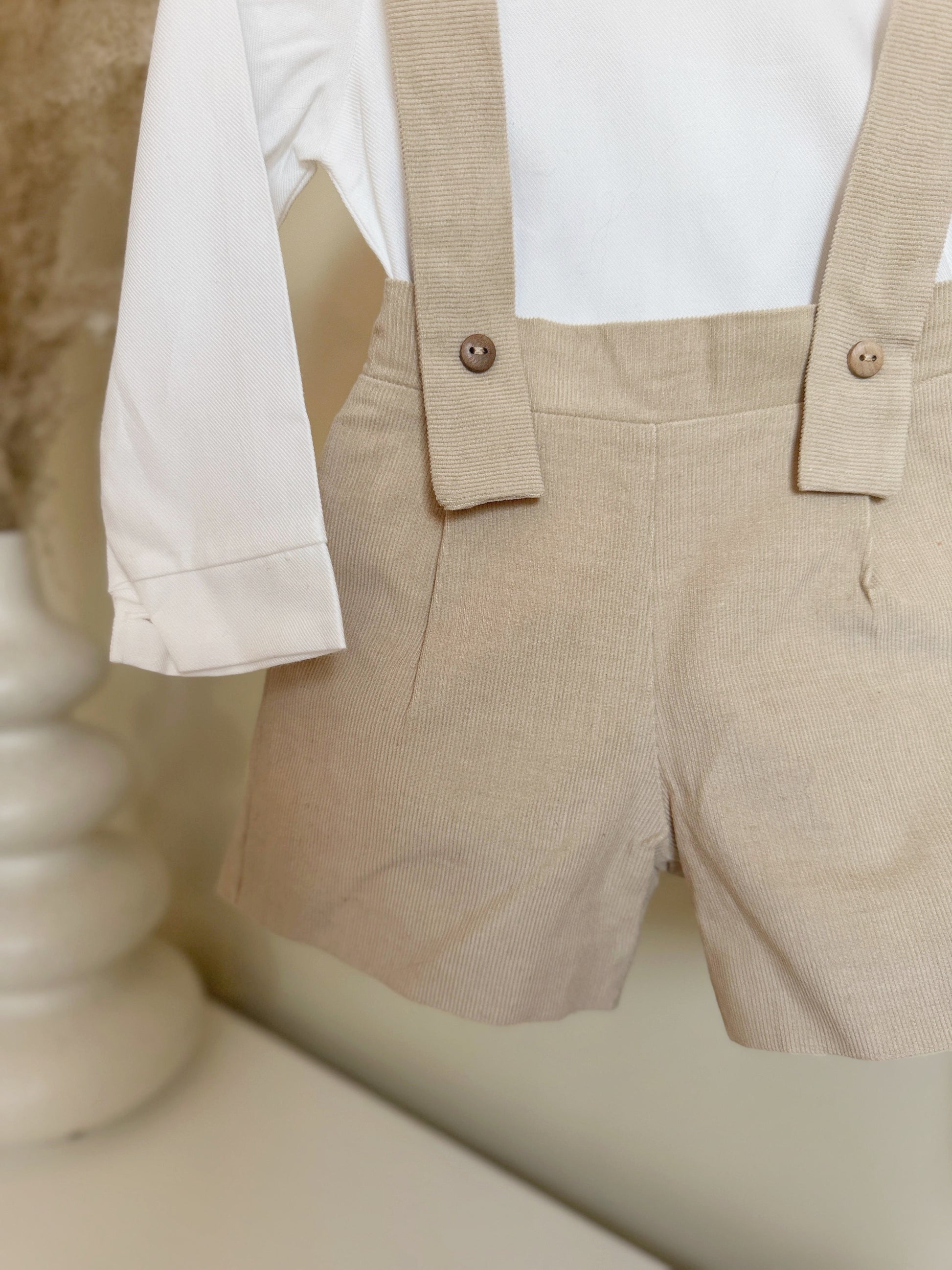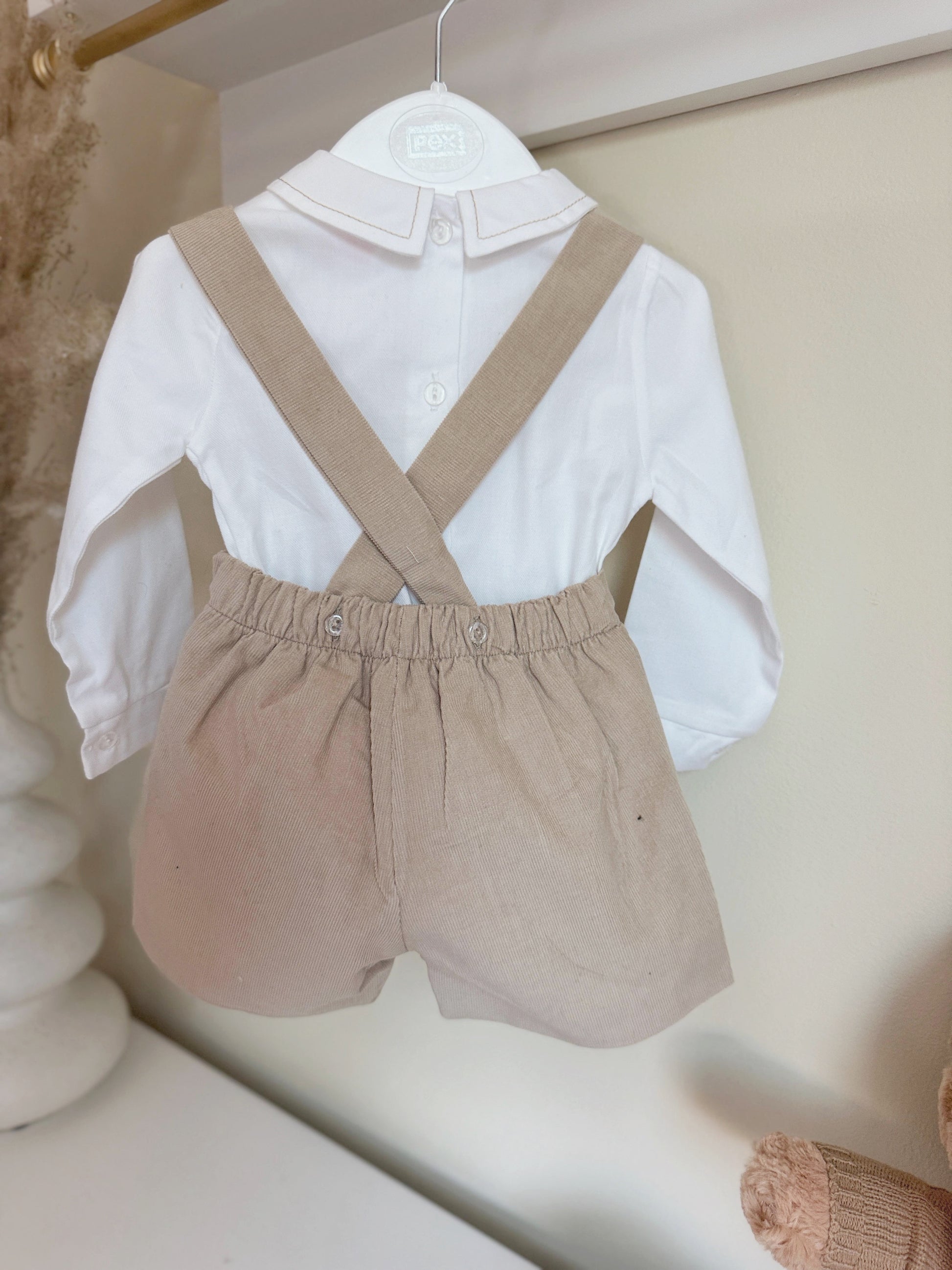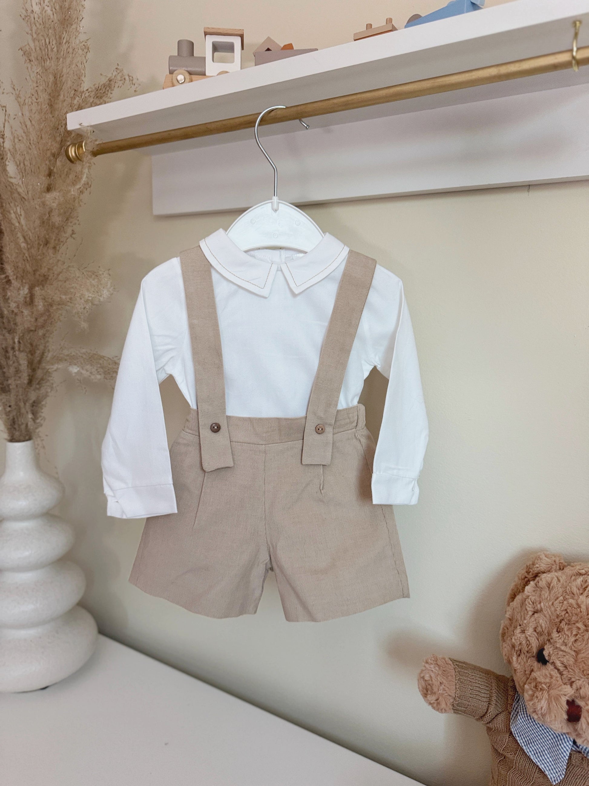 This 2-piece set features a stylish brown overall and a crisp white bodysuit.