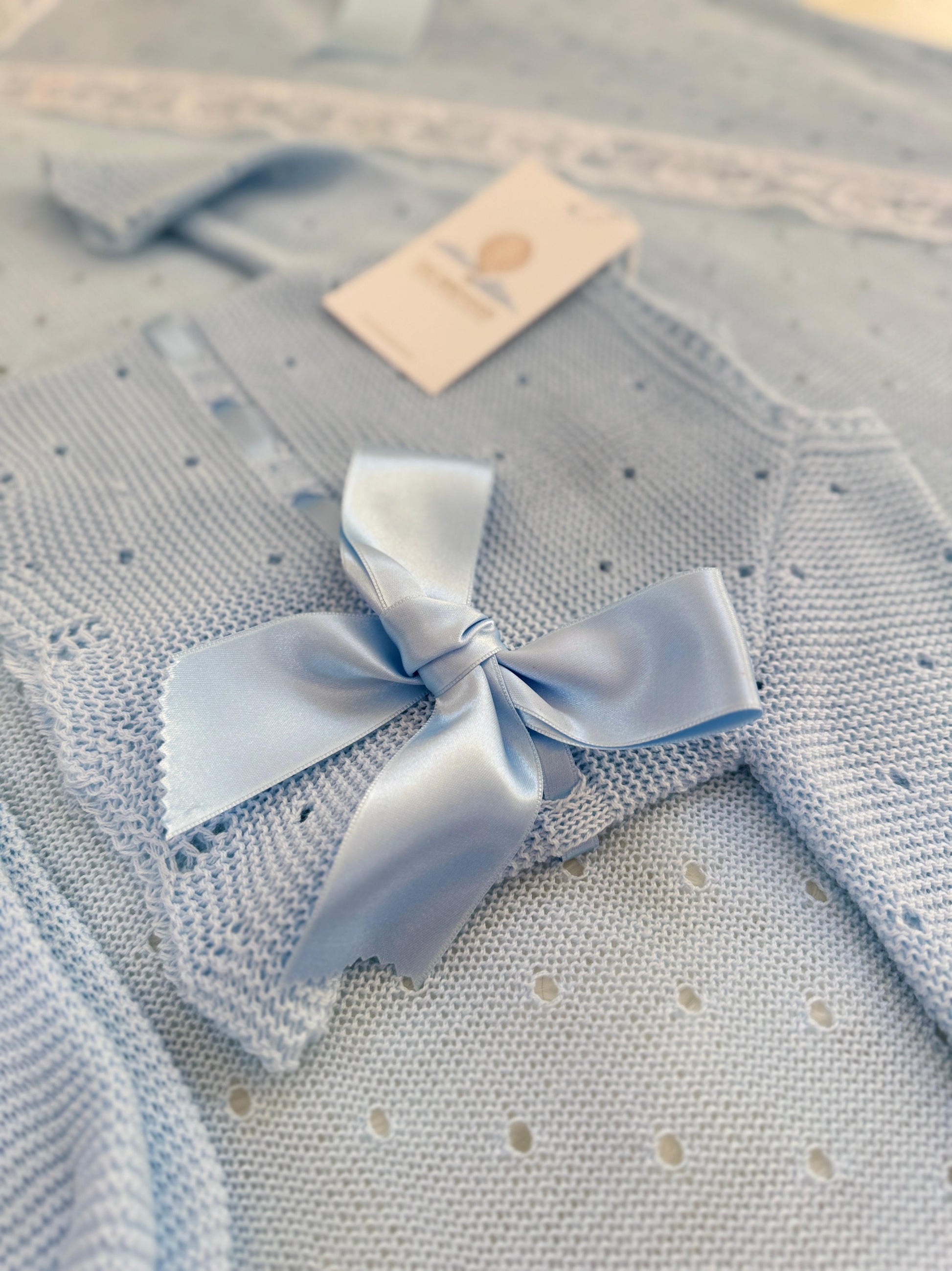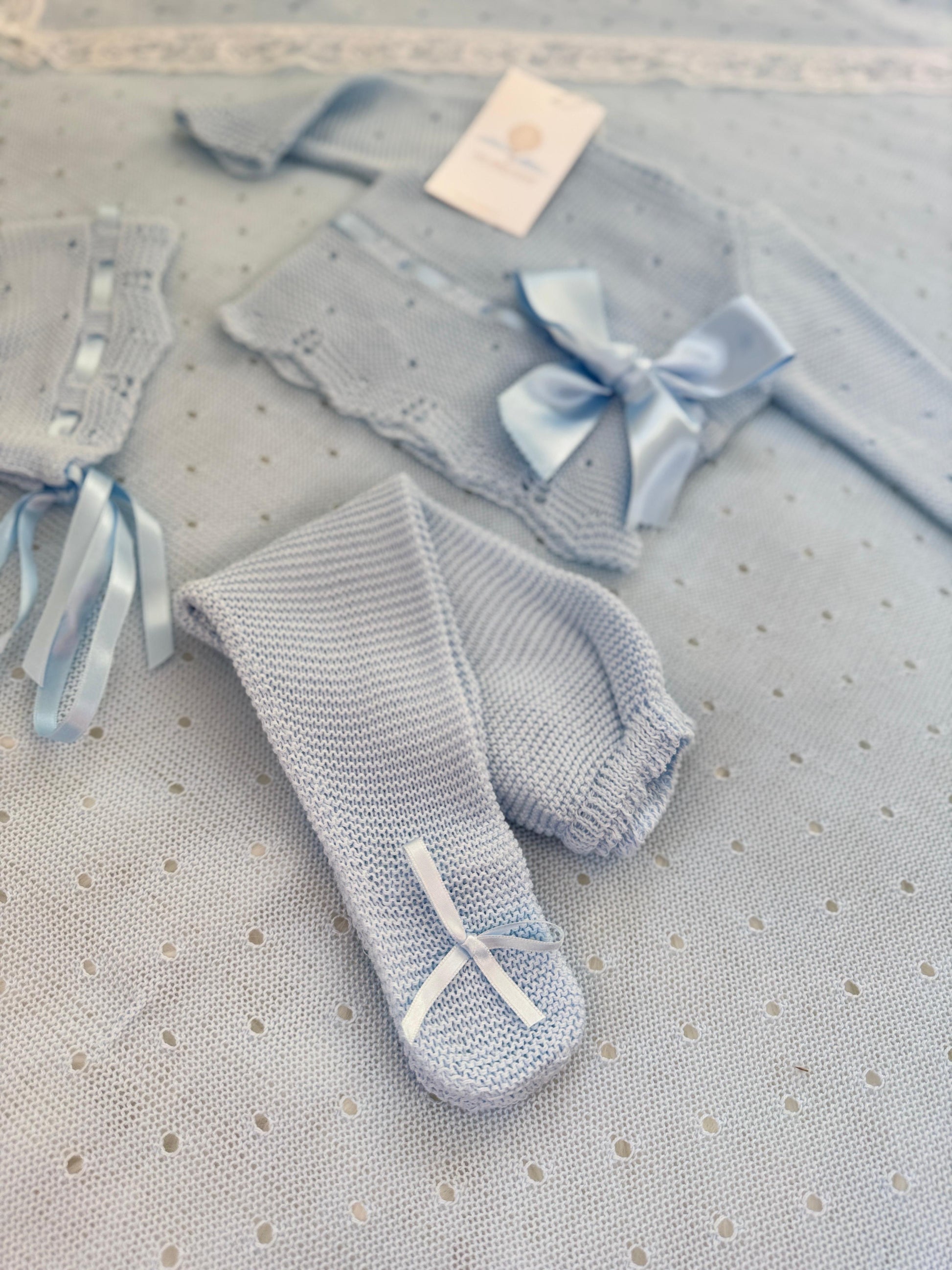 Our Elay Set in charming blue. The set includes a knitted top adorned with a statement ribbon, as well as a hat and pants.