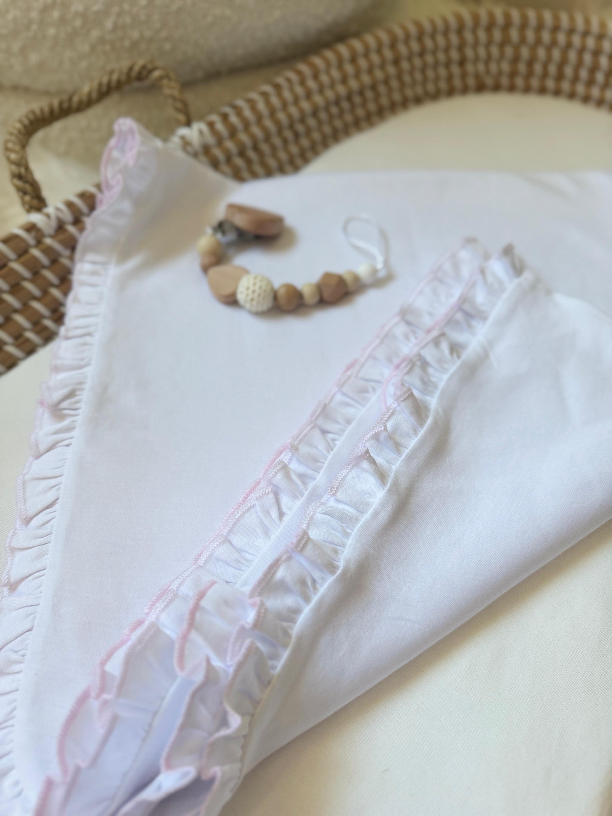 Wrap your little one in the soft and delicate Elodie Blanket. With its baby blanket white color and charming ruffles in pink, this blanket is perfect for keeping your baby cozy and stylish. Give your baby the best with the Elodie Blanket.