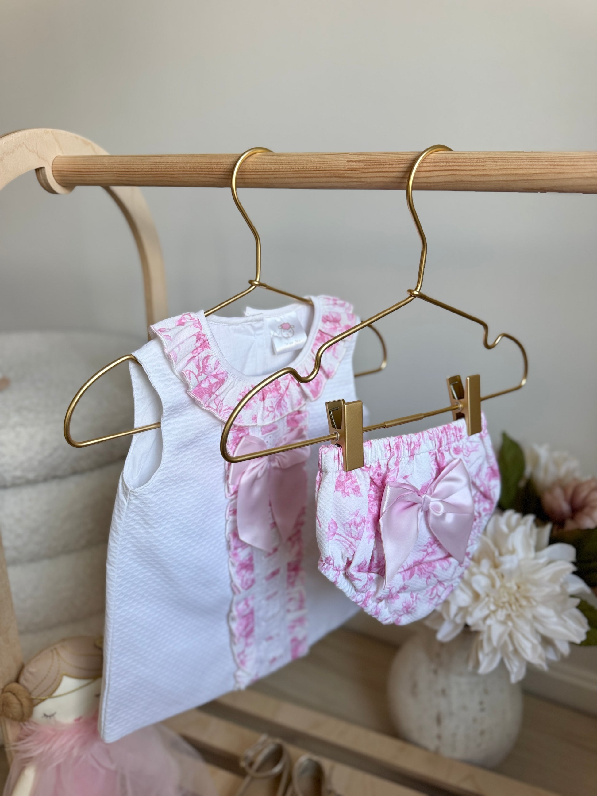 Get ready for springtime with our stunning Flora Dress! Featuring beautiful white fabric with delicate toile pink and white details and a satin bow, this dress is perfect for any occasion. It even comes with a matching diaper cover for added convenience. Embrace the season in style with our Flora Dress!