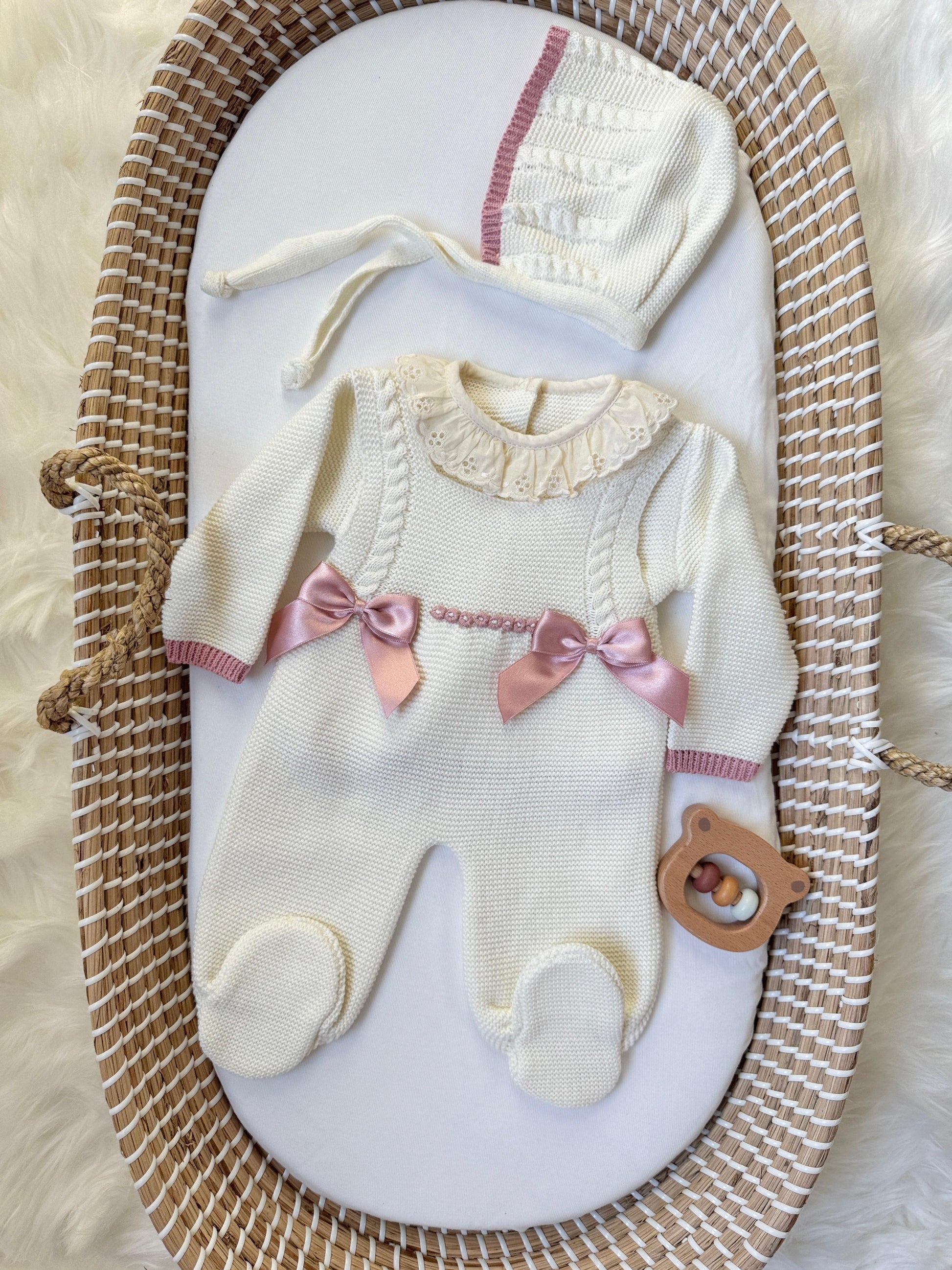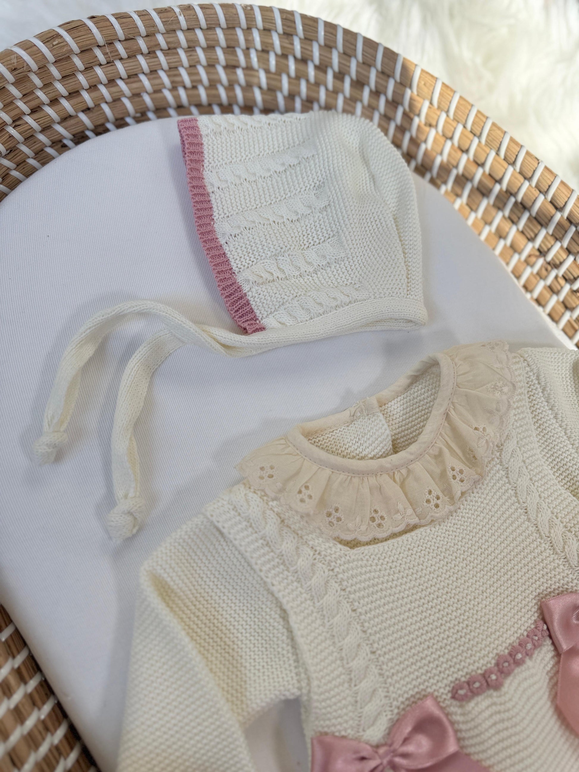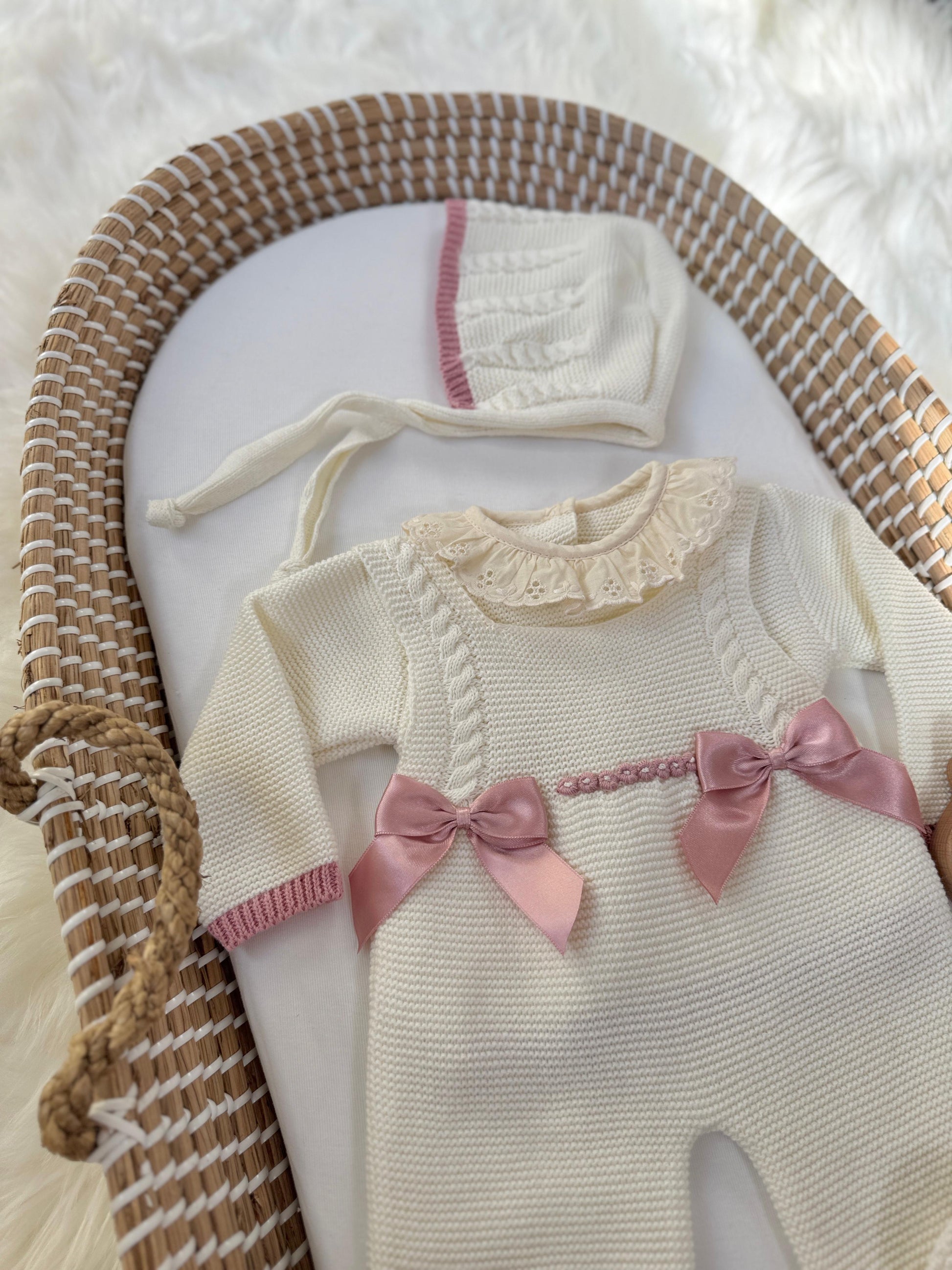 This set includes a hat, top, and overall with 2 adorable bows and a charming collar detail.