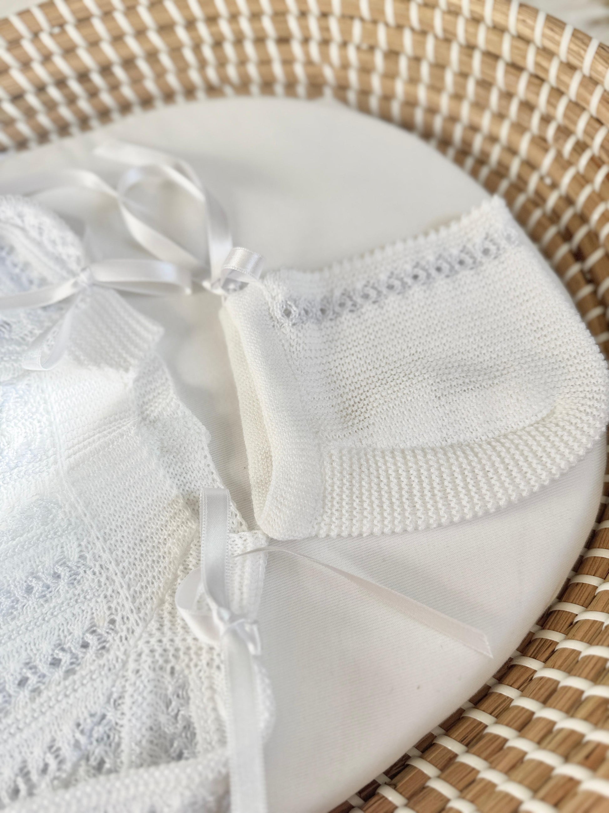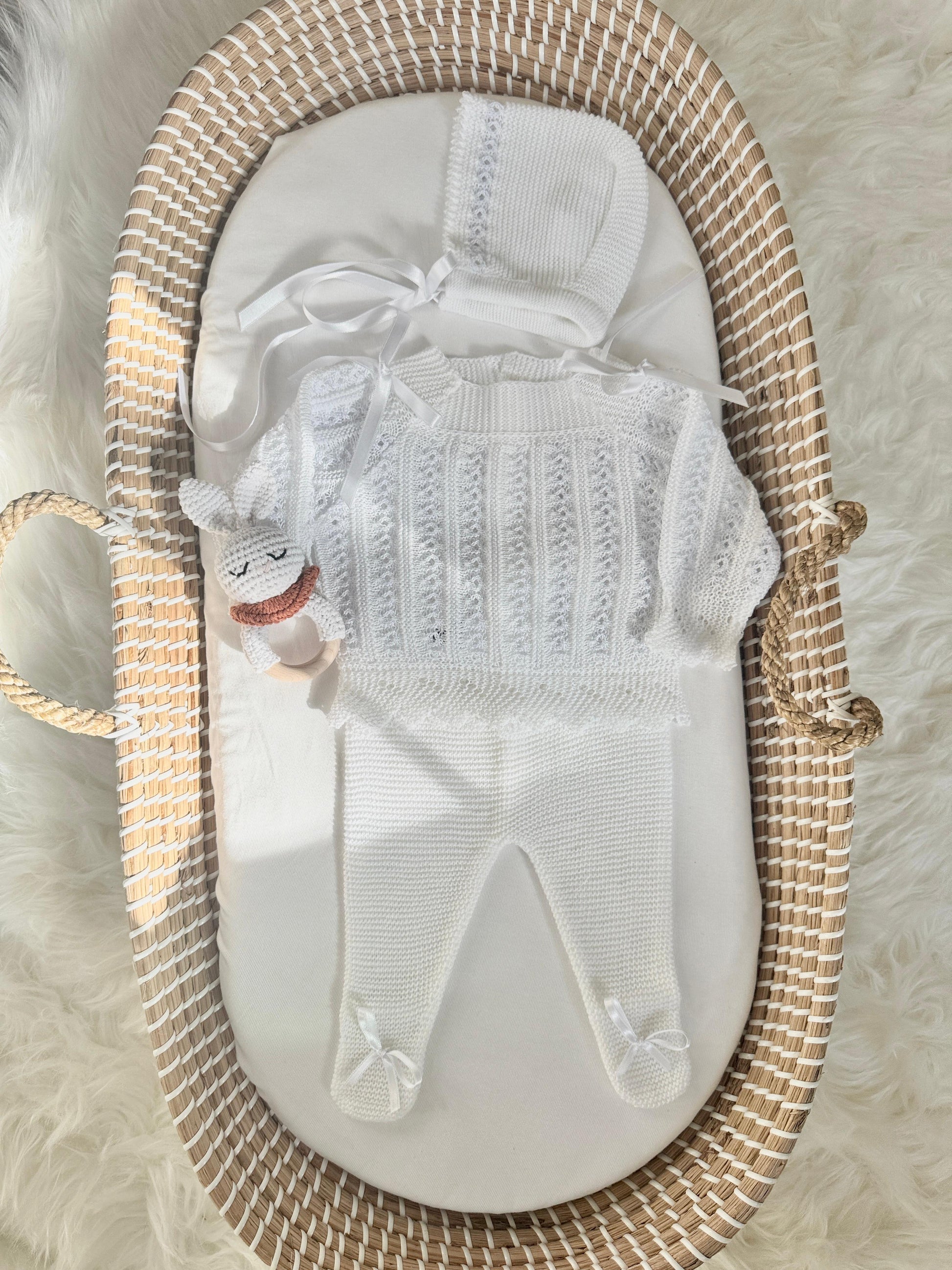 Introducing the Johan Set - White! This adorable 3-piece set is perfect for your little one, complete with a stylish hat and lace detailing. Made for baby girls or boys, this set features ribbons for added charm.