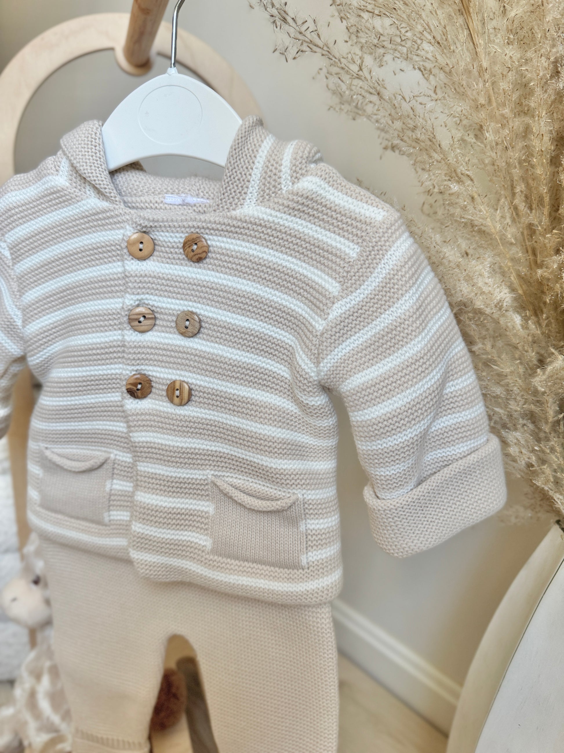 Introducing the Joseph Knitted Set - Beige! This cozy and stylish set includes a striped jacket with adorable buttons and matching pants. Stay warm and fashionable this season with the Joseph Knitted Set.
