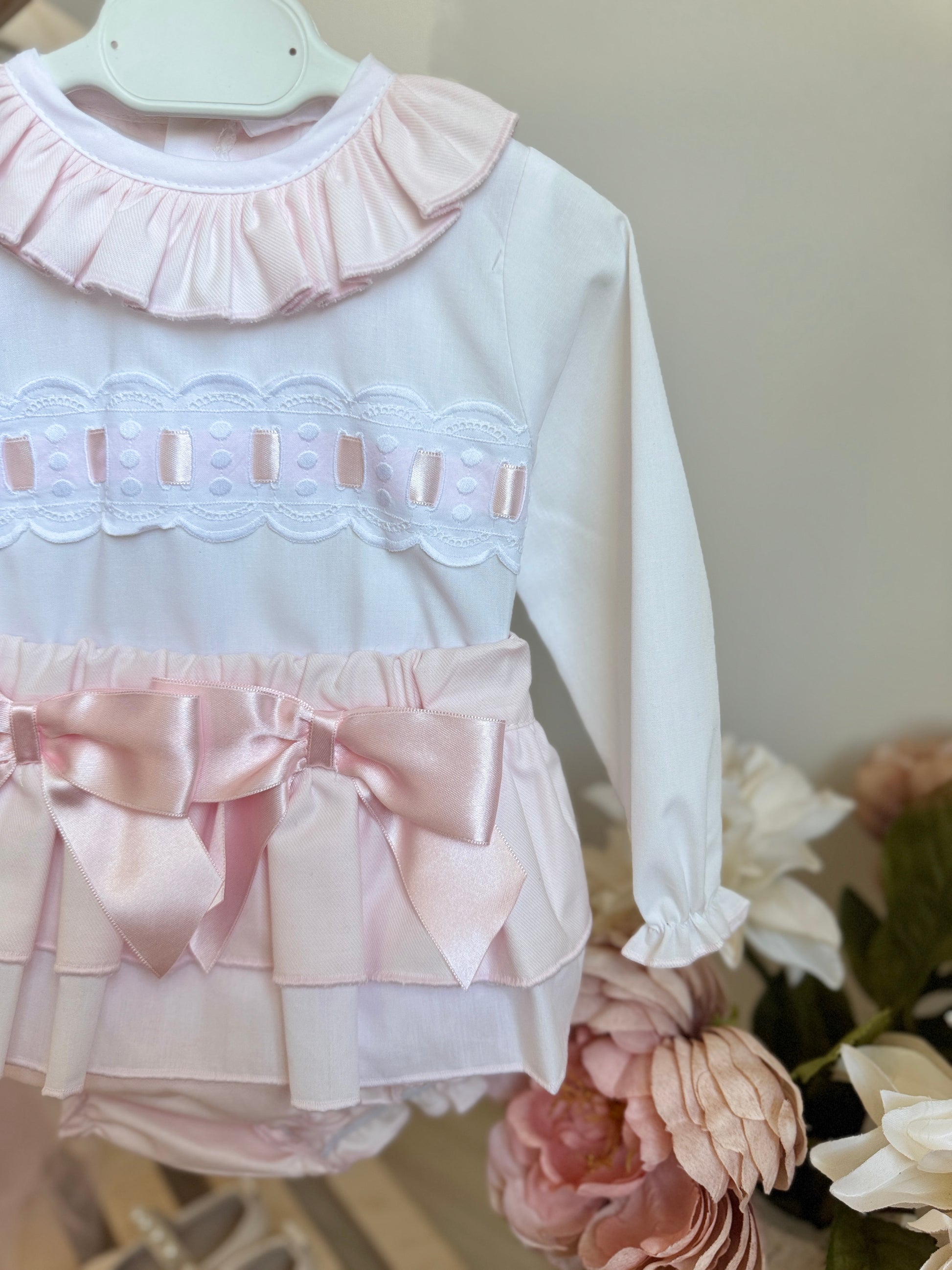 Experience elegance with the Juniper Skirt Set. The white long sleeve top features delicate pink silk details and a ruffled neck, while the matching skirt boasts a playful ruffle design and charming pink silk bows. Perfect for any occasion, this set will bring a touch of sophistication to your wardrobe.