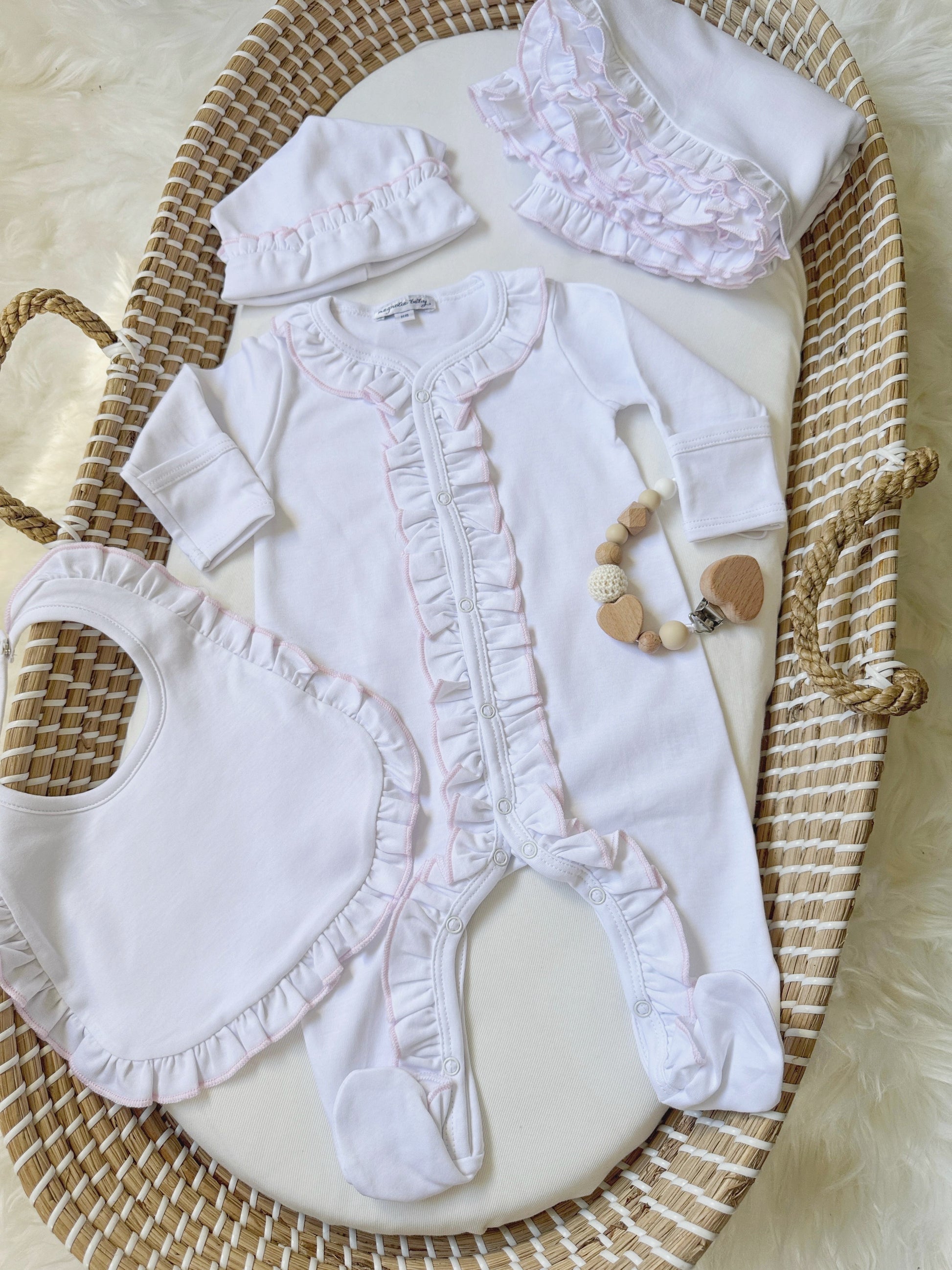 Our coming home outfit! What baby dreams are made of! 100% Pima Cotton material them so soft, classic and elegant. These sets are a hospital bag must have!