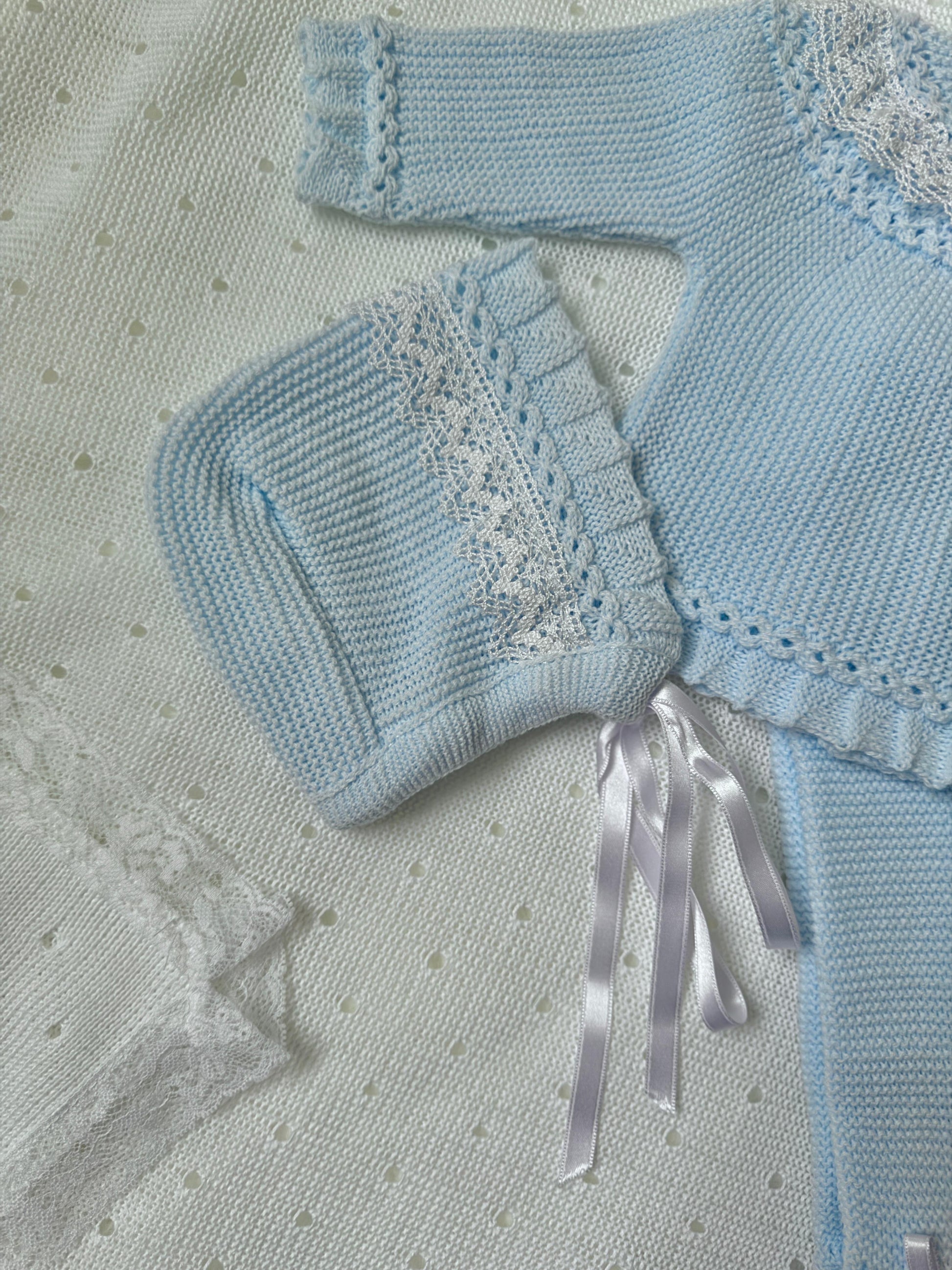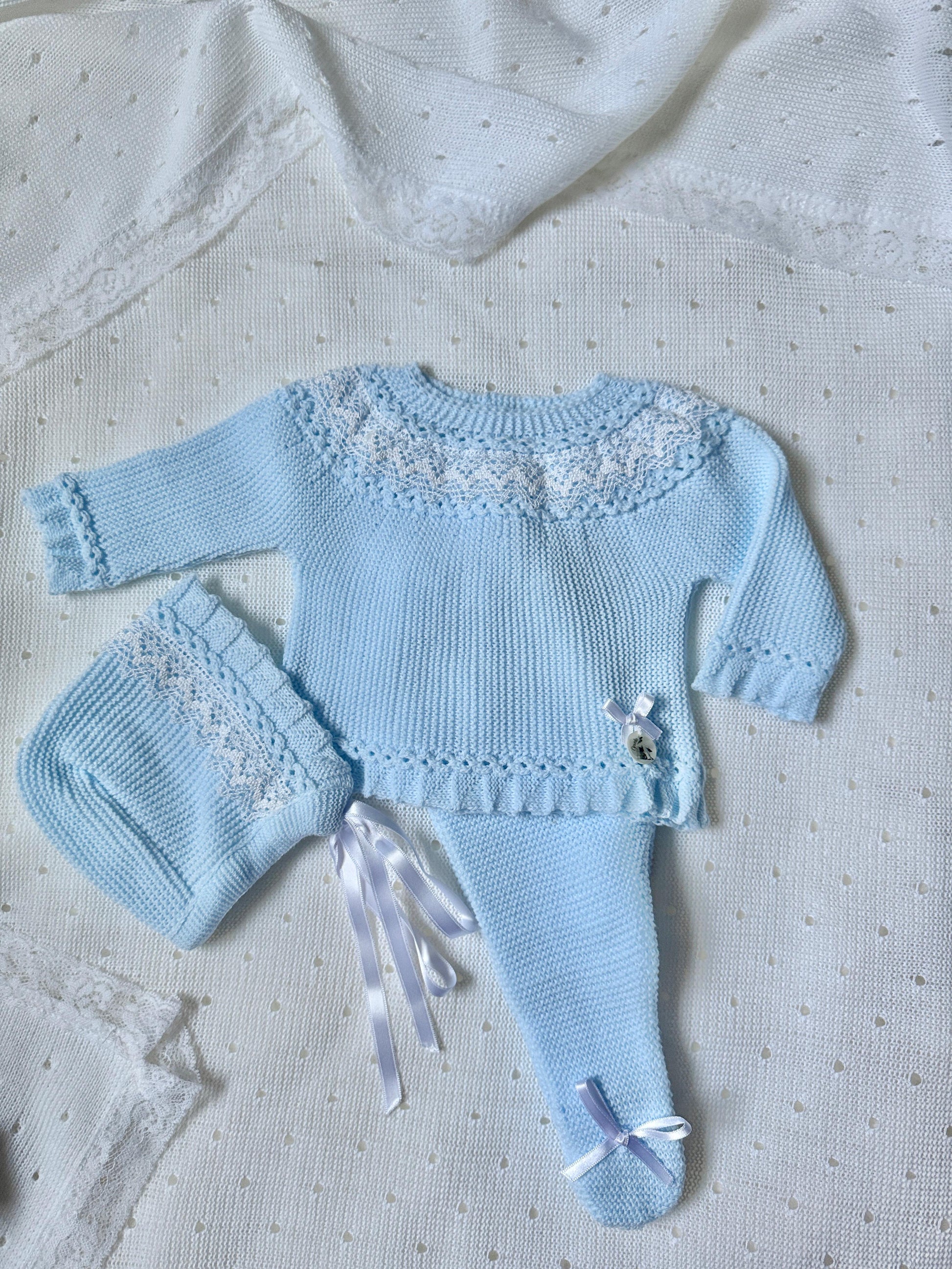 This adorable 3-piece set features elegant blue and white details on the collar and hat, making it the perfect outfit for any stylish baby boy.