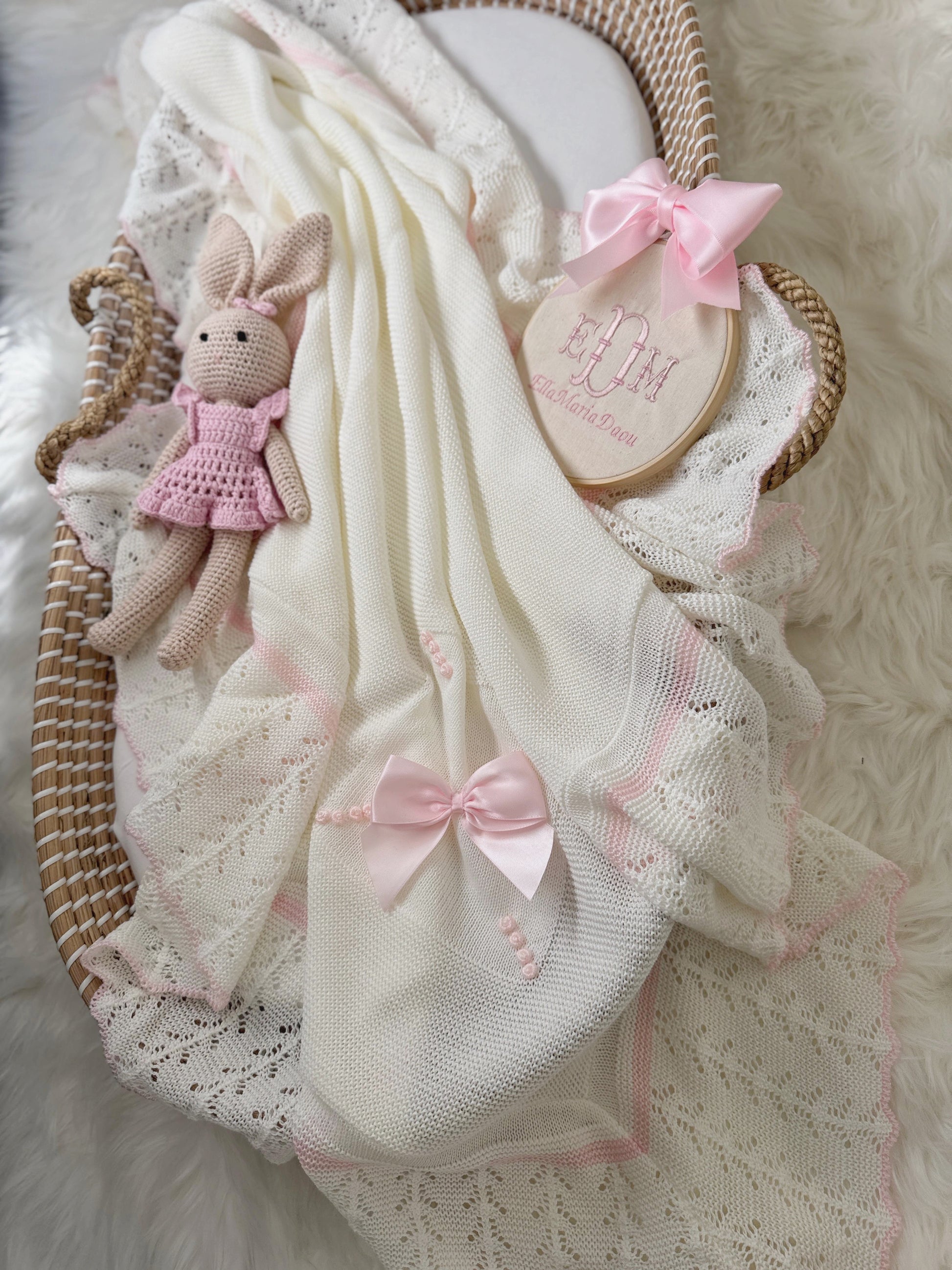 Made of soft knitted material, this blanket features intricate crochet details and a charming bow.
