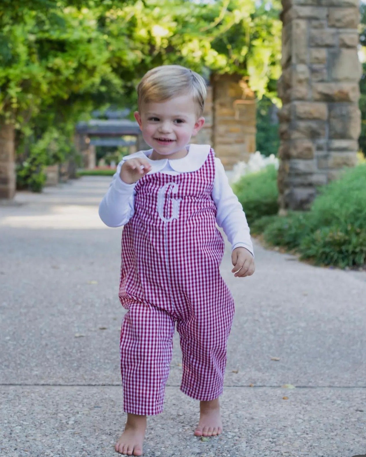 Transform your little boy into the cutest bundle of joy with our Marvin Overall in a charming red and white gingham print.