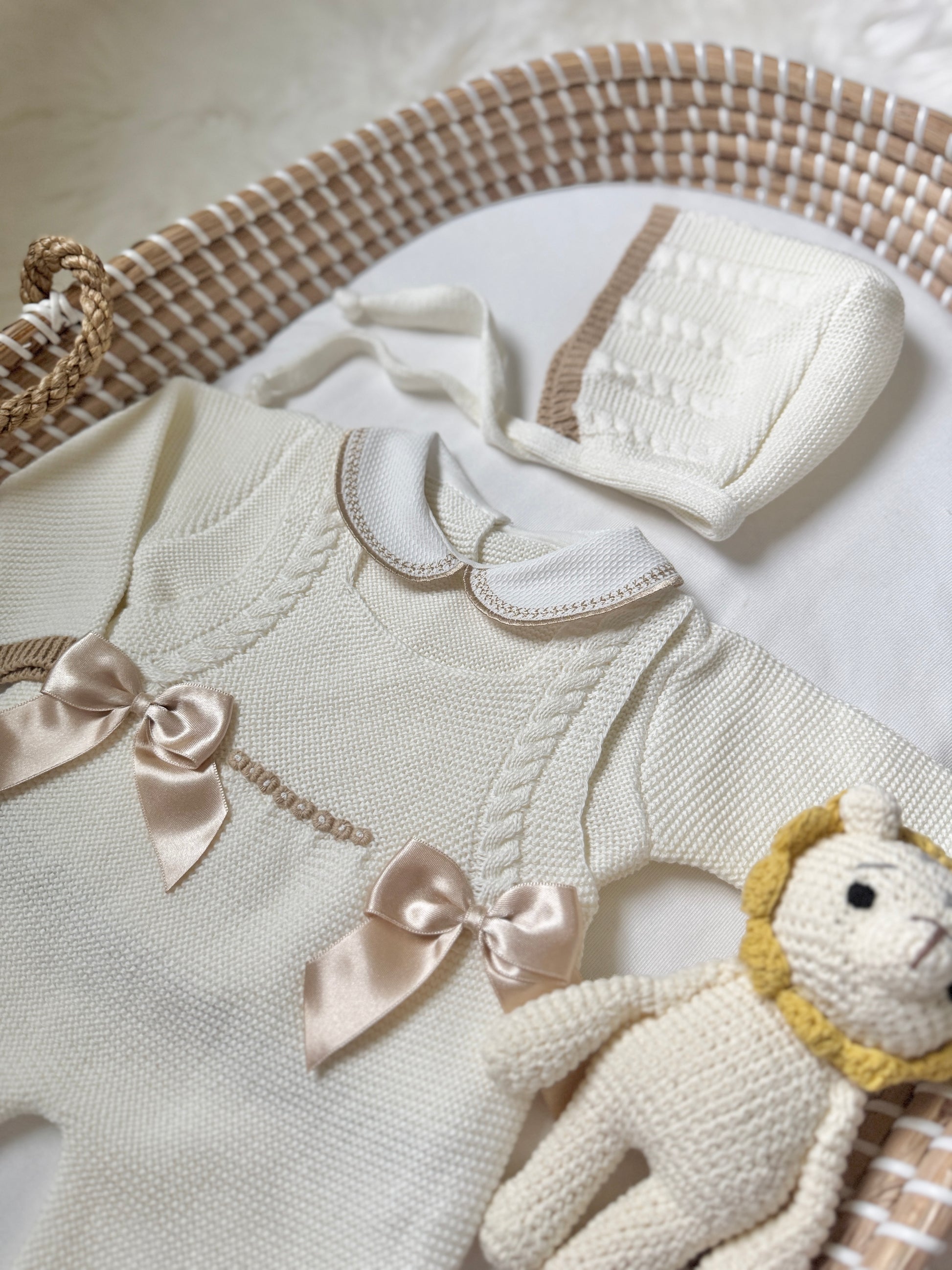 Introducing the Maryana Overall in Cream and champagne - the perfect combination of elegance and playfulness for your little one! This charming overall features 2 adorable bows and intricate details that will make your baby girl stand out.