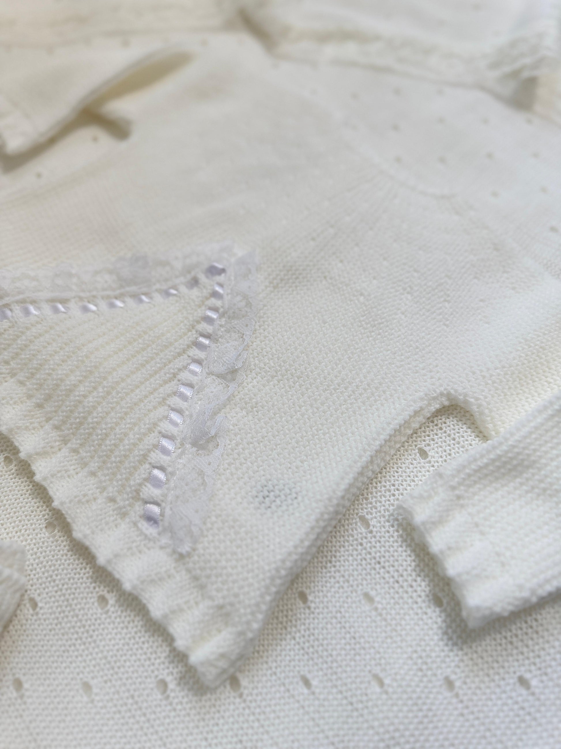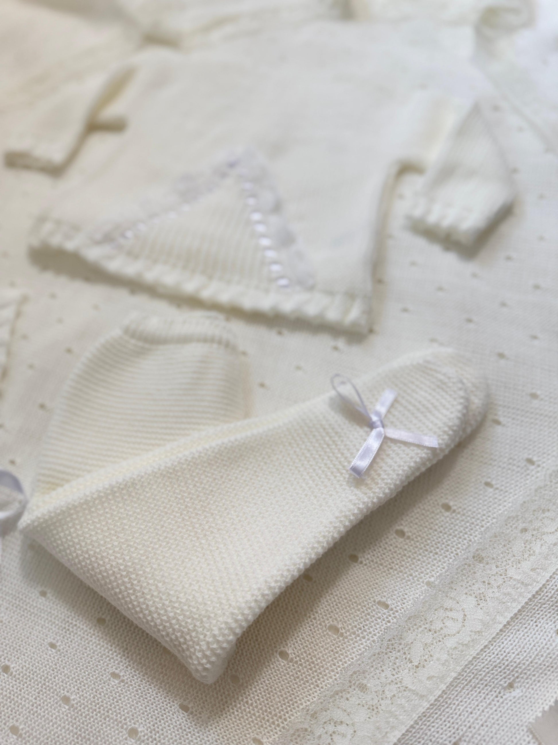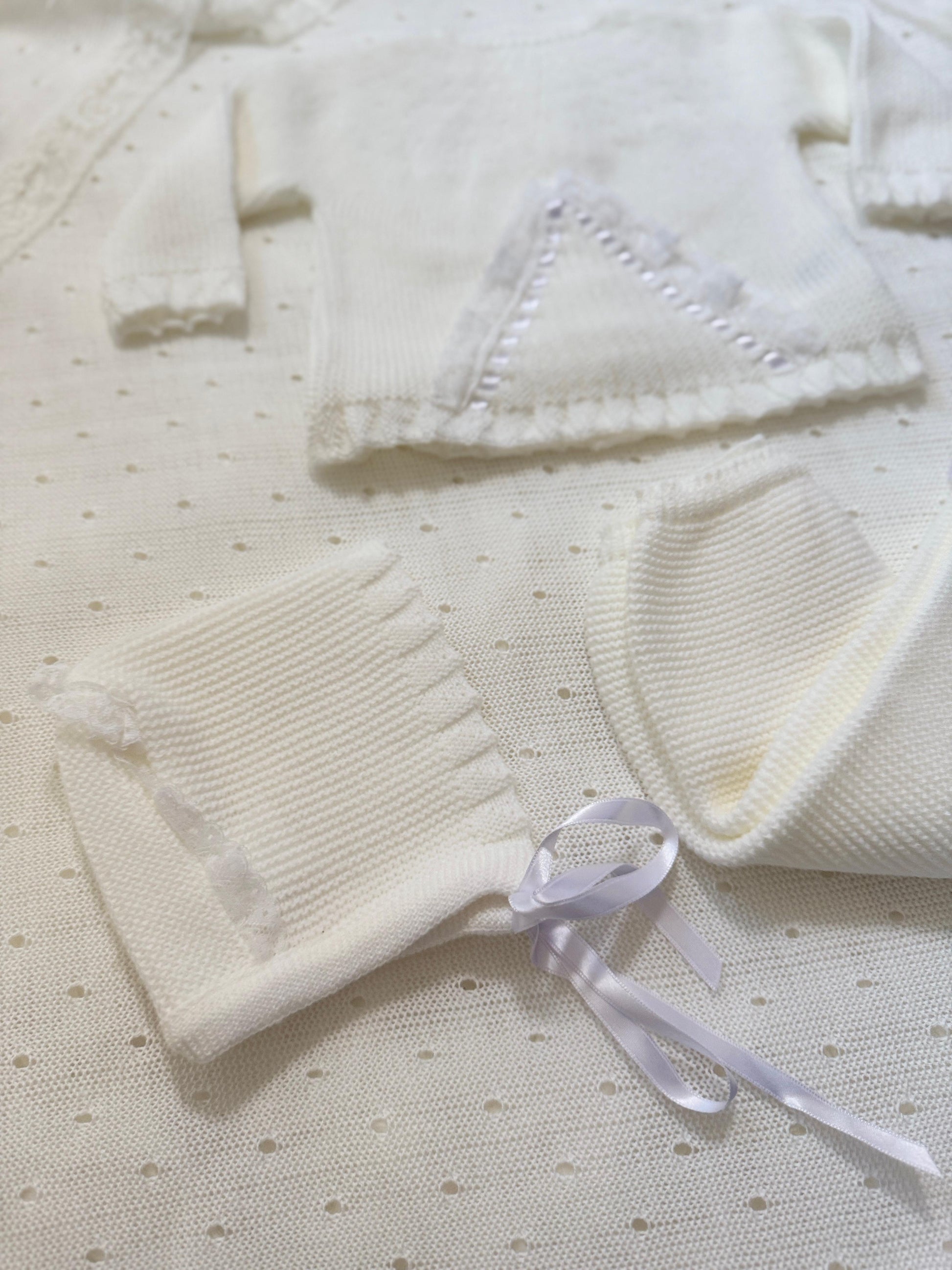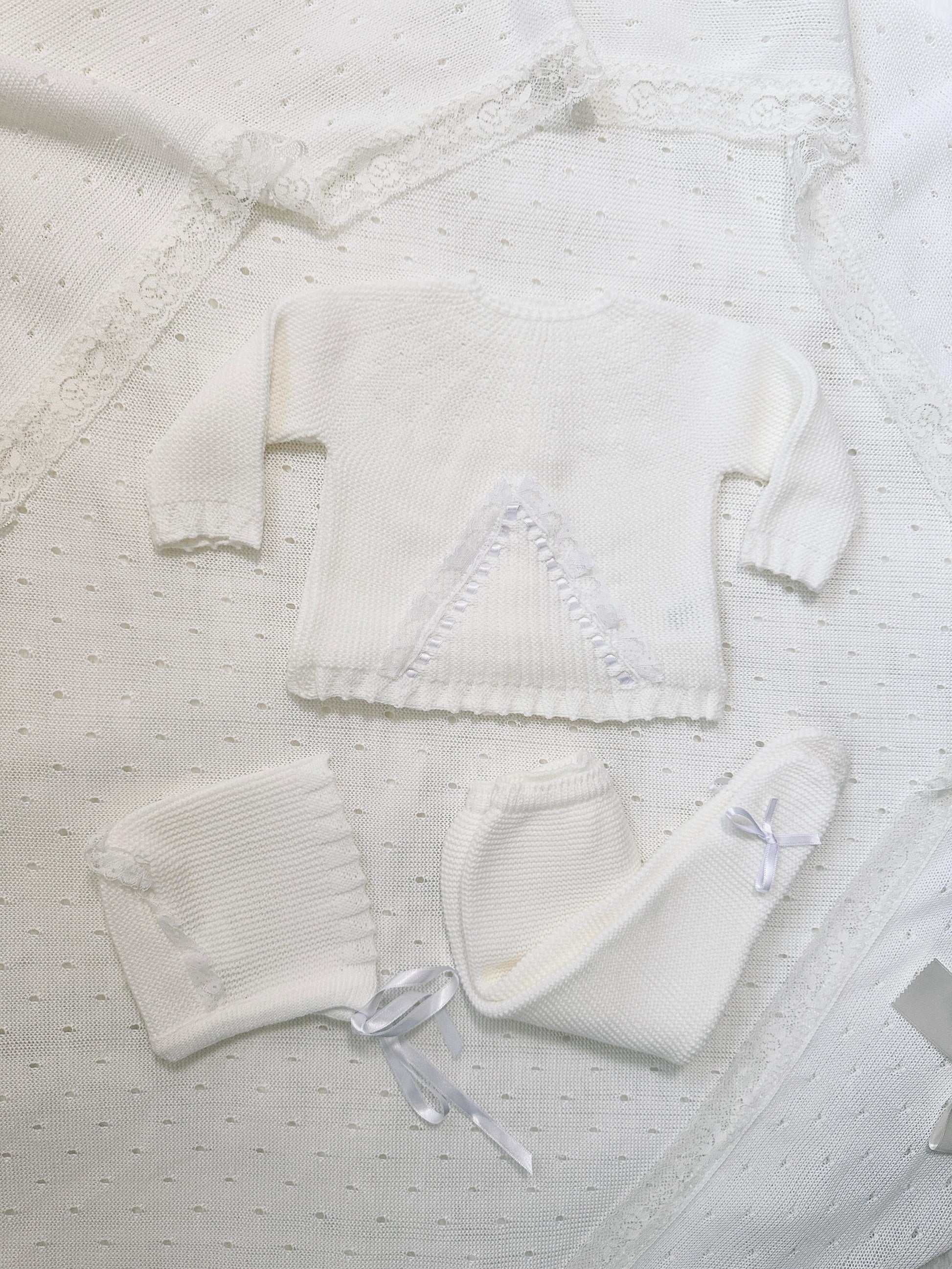 This set is features a hat, pant and top with delicate dentelle detail and a charming bow adorned with ribbon. This set will add a touch of sophistication to your baby's wardrobe.