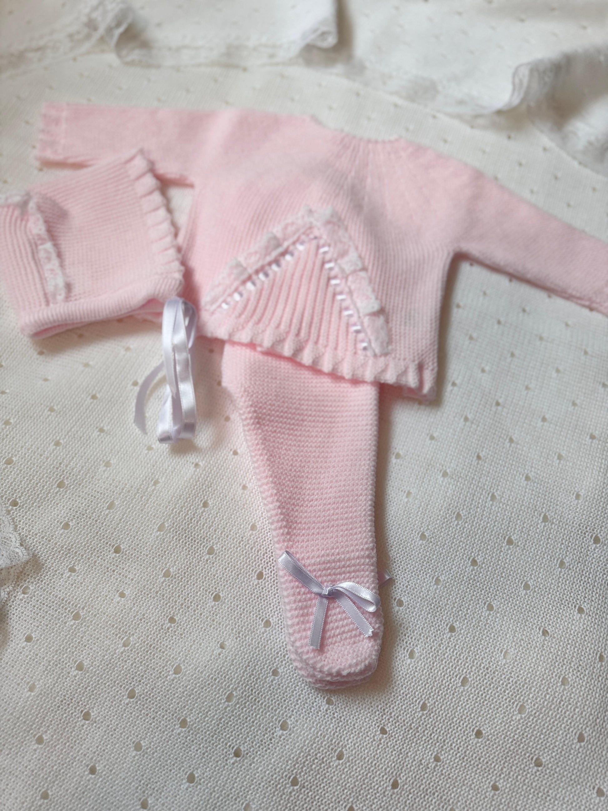 This set is features a hat, pant and top with delicate dentelle detail and a charming bow adorned with ribbon. This set will add a touch of sophistication to your baby's wardrobe.