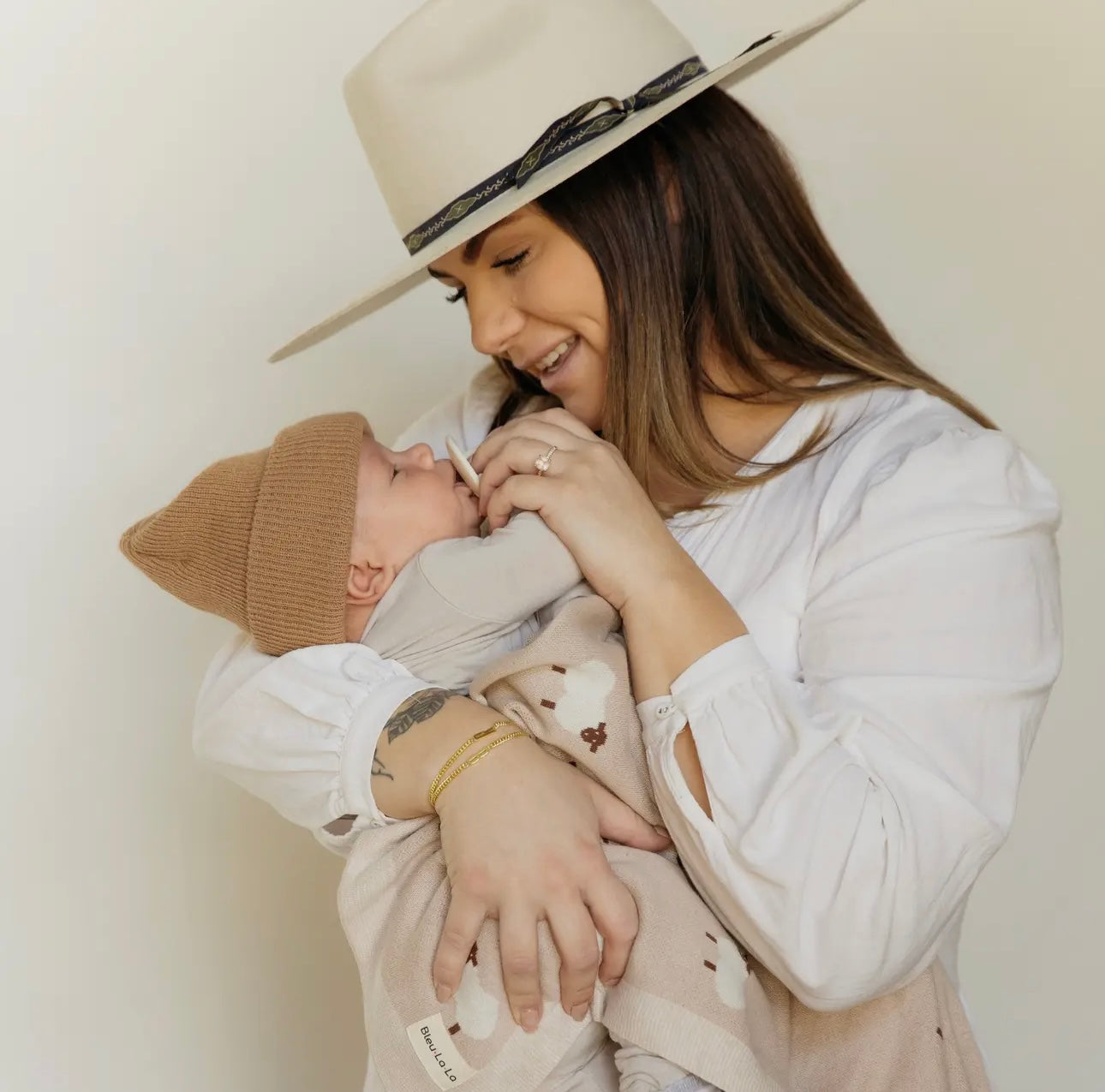 Introducing our Sheep Blanket in Beige - made of 100% cotton and featuring adorable little sheeps, this blanket is perfect for newborns and can even be personalized. Stay cozy and stylish with this must-have accessory for your little one.
