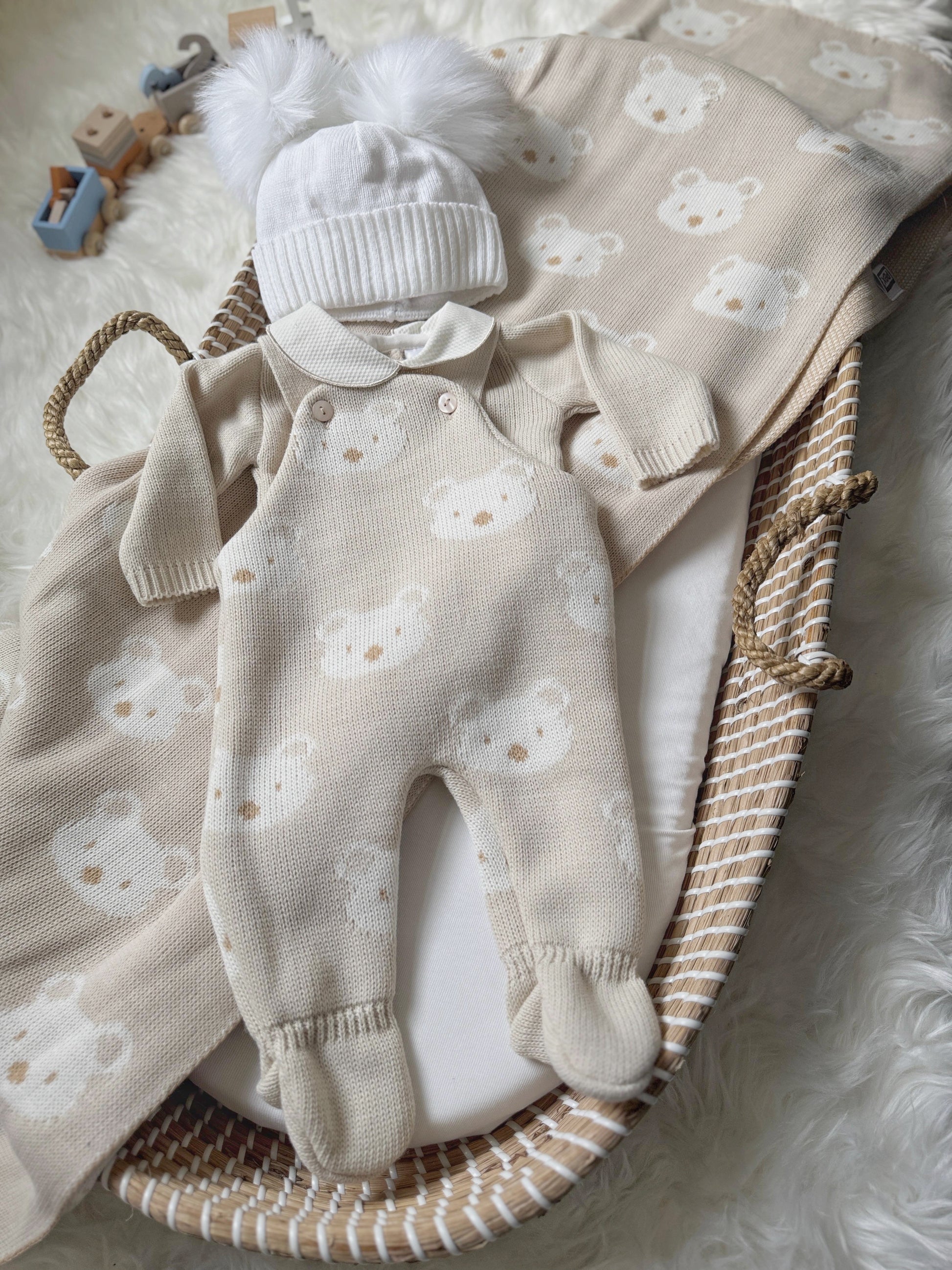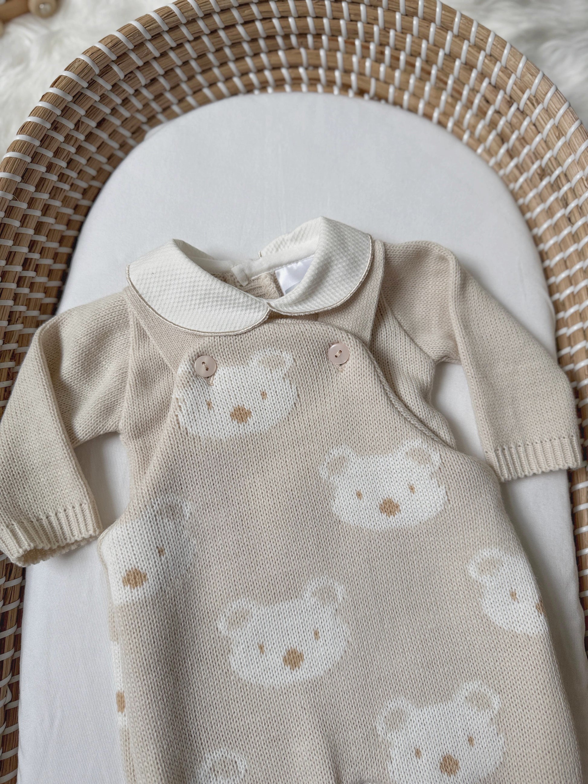 The adorable beige and white knit set includes 2 pieces (the body suit and the overall) and it's perfect for your little one!