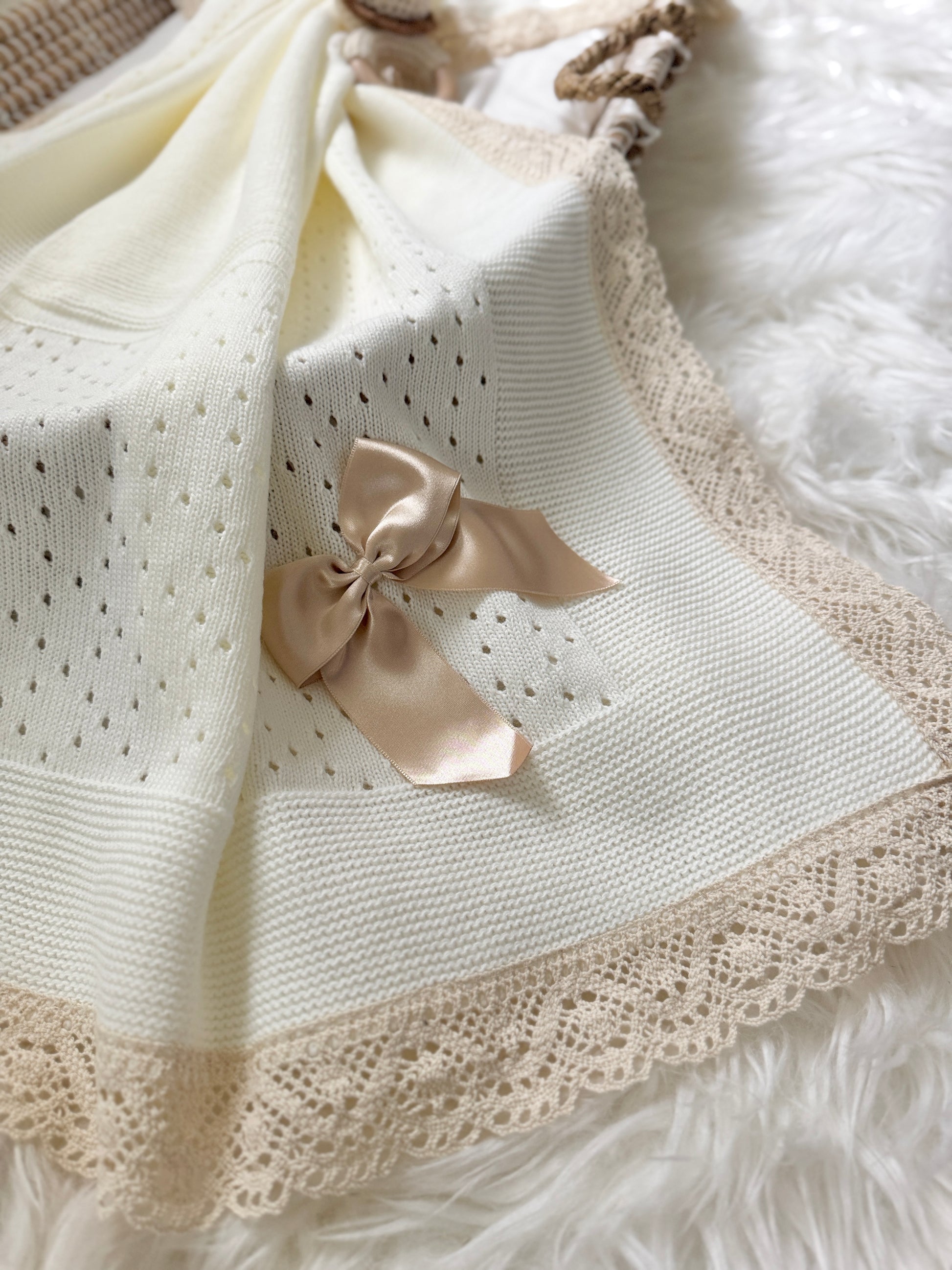 The perfect addition to your baby girl's nursery! Made with the softest cream fabric and adorned with a delicate champagne satin bow and dentelle detailing, this blanket provides both comfort and style.