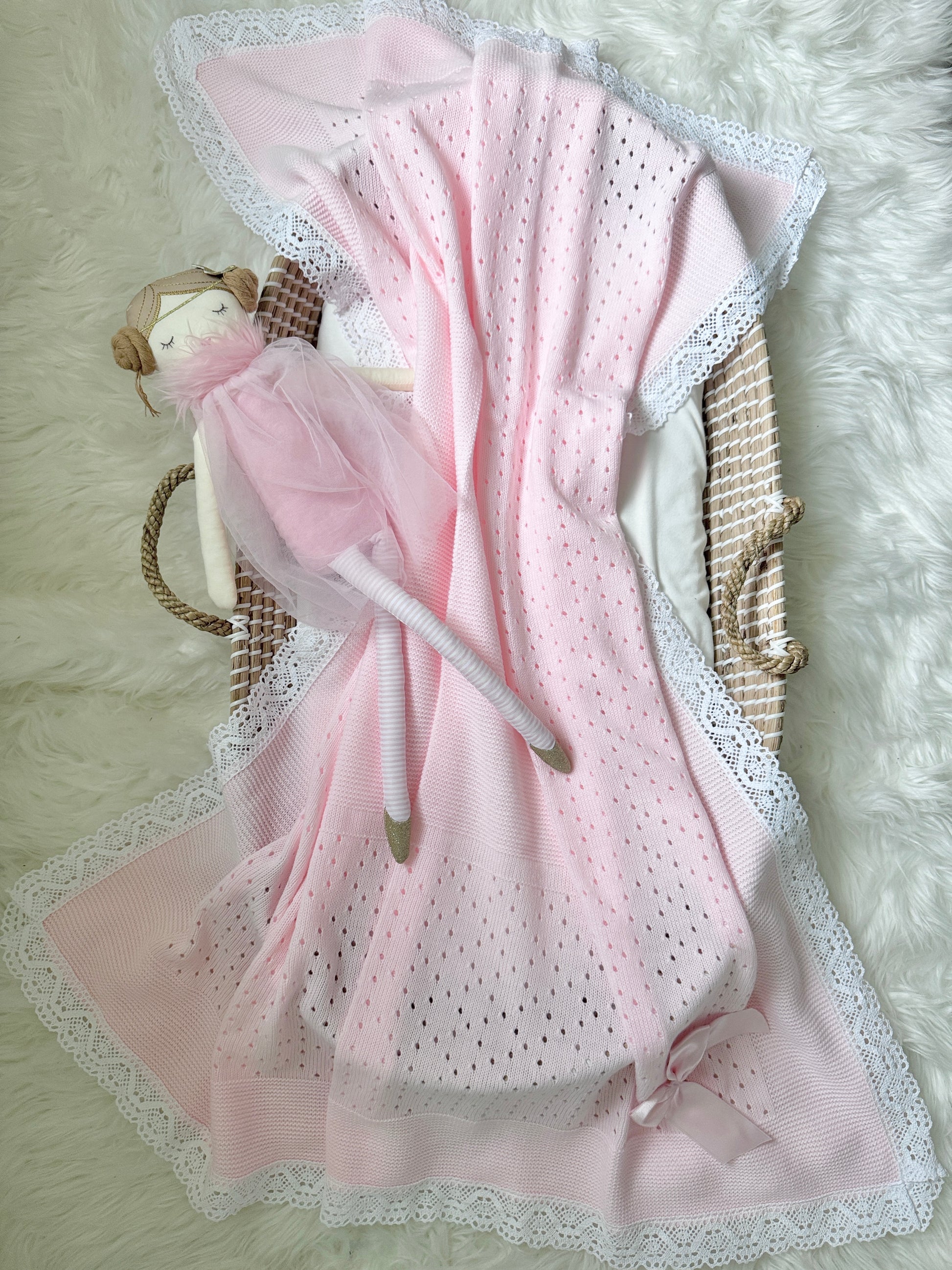 The perfect addition to your baby girl's nursery! Made with the softest light pink fabric and adorned with a delicate light pink satin bow and white dentelle detailing, this blanket provides both comfort and style.